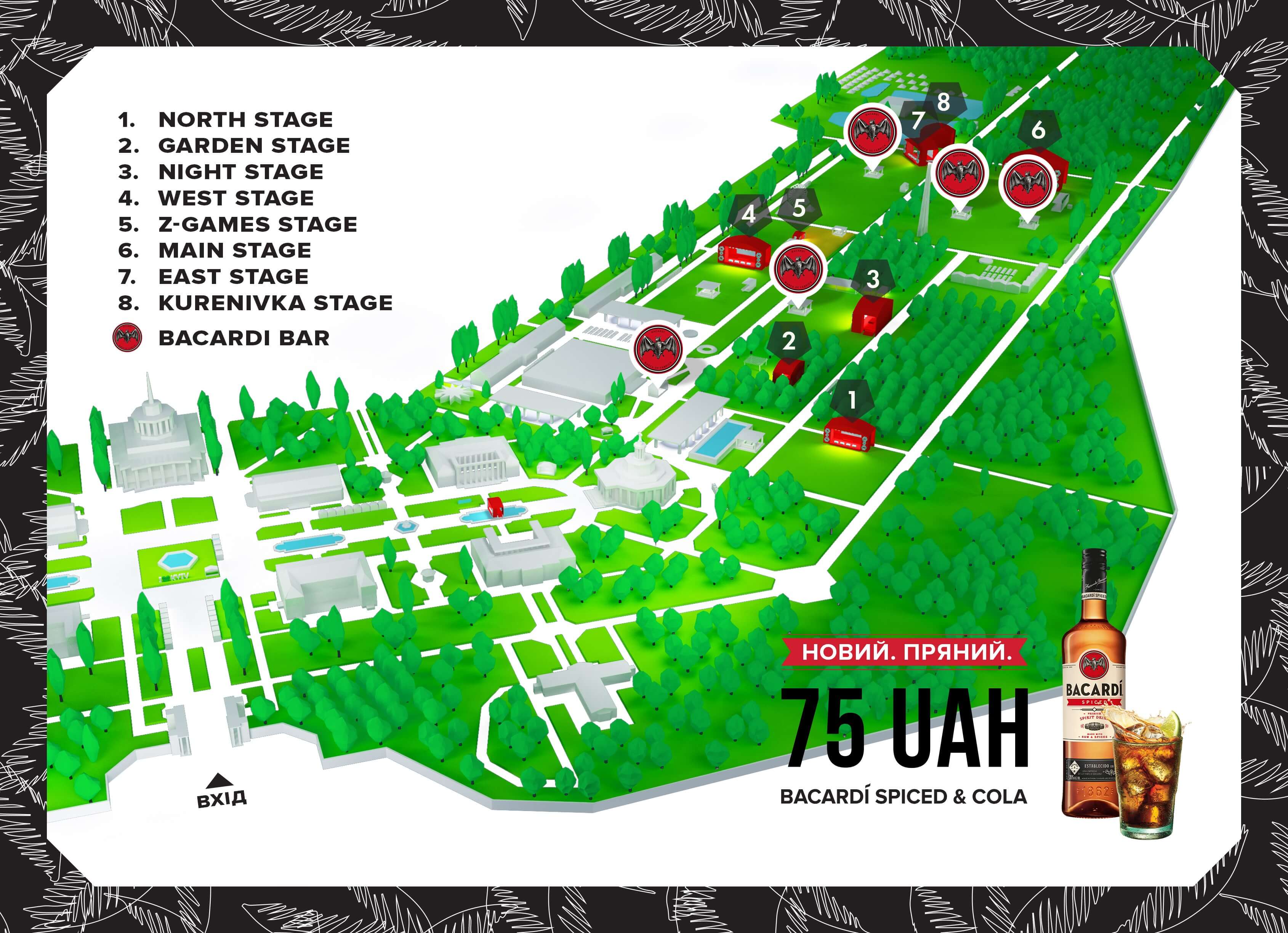 В этом году на территории фестиваля будет расположено целых 5 баров Bacardi, которые помогут избежать очередей и упростят передвижение от одной сцены к другой (а всего их 8). В перерывах между концертами можно поваляться на траве, потанцевать или отправиться попробовать новинку – коктейль с пряным ромом Spiced в один из баров Bacardi. Во время антрактов на мейн-баре Bacardi будут играть диджеи, которые подготовят вас к любимым исполнителям. Готовьтесь танцевать до упаду!