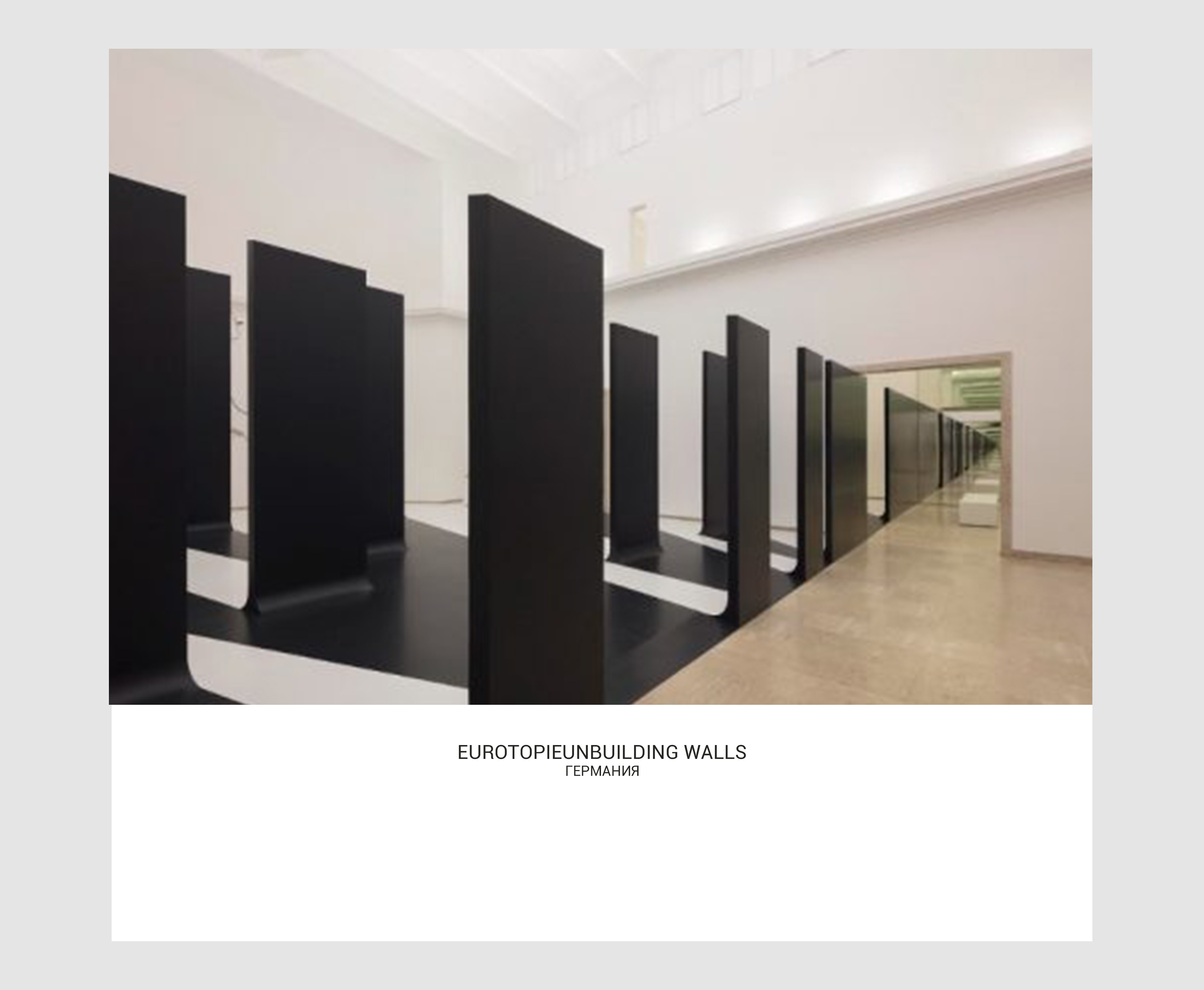 Тема свободы в отсутствие стен отражена в проекте павильона Германии: здесь рассматривают развитие тех территорий, где 28 лет стояла одна из самых одиозных стен в мировой истории – Берлинская. Залы заставили черными панелями, создав оптическую иллюзию, которая помимо своей художественной функции проверяет на прочность вестибулярный аппарат посетителей. Отказаться от строительства стен в пользу создания пространств призывают и в павильоне Франции, рассматривая ряд проектов регенерации в разных точках страны. Но самой обсуждаемой стеной на нынешней биеннале стал фрагмент фасада комплекса социального жилья Robin Hood Gardens, привезенный в Венецию лондонским Музеем Виктории и Альберта, который выкупил часть наполовину снесенной уже памятки архитектуры брутализма для своей коллекции.