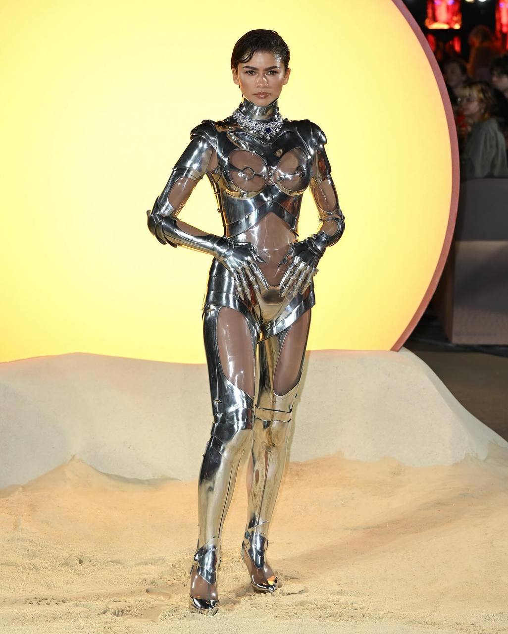 Допремʼєрні покази сиквелу кінокартини «Дюна: Друга частина» за культовими романами Френка Герберта захоплюють масштабністю та фантастичними появами знаменитостей. Цього разу на допремʼєрному показі Зендая зʼявилася в архівному костюмі Cyborg Thierry Mugler 1995 року. Кольє Bulgari обрамило фантасмагоричний костюм, додавши розкоші.