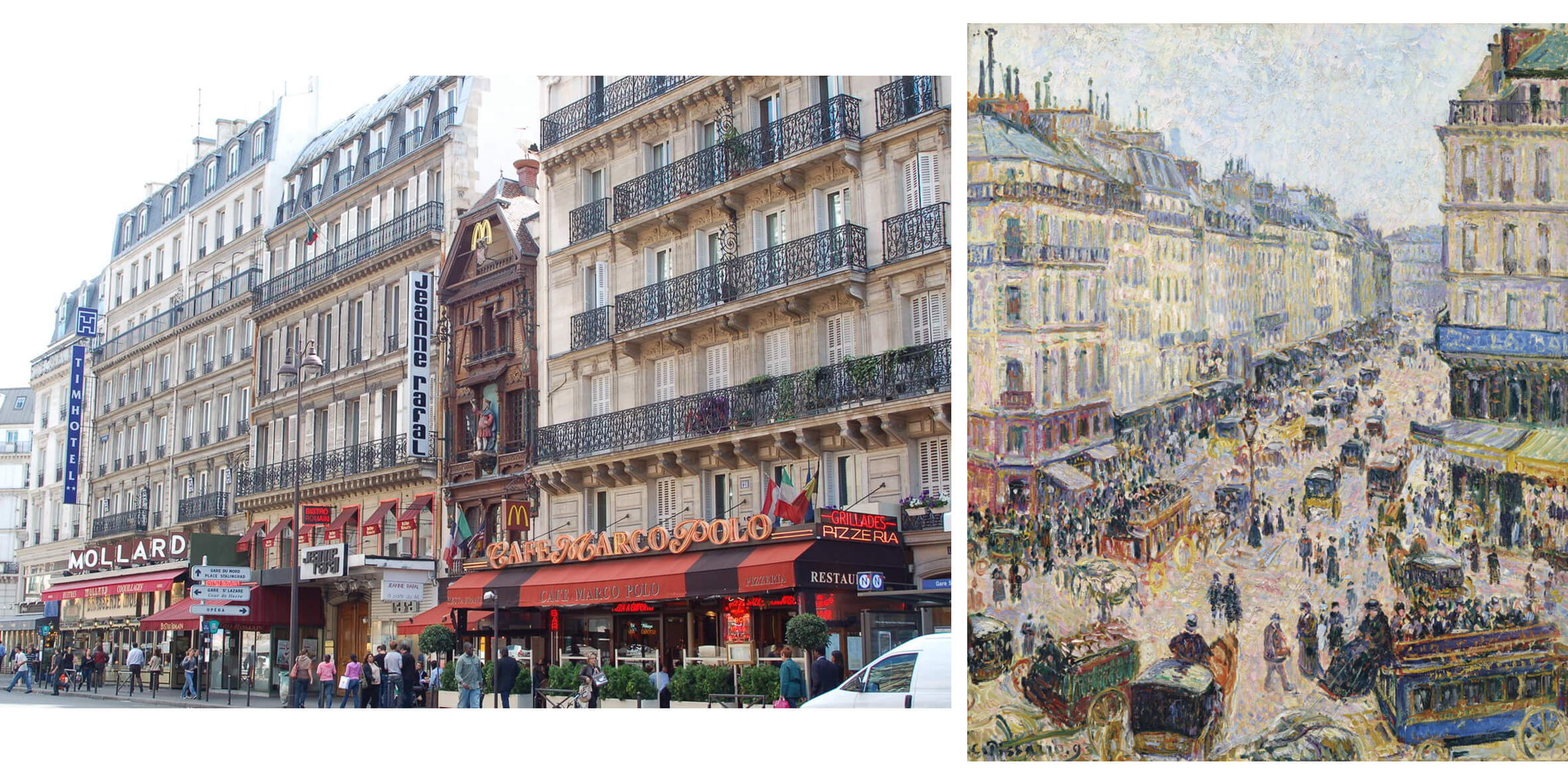 “Улица Сен-Лазар, солнечная погода”, 1893. На улице расположен одноименный вокзал, рядом с которым жили Клод Моне, Гюстав Кайботт и Эдуард Мане. В 1998 музей Орсе даже открыл выставку под названием “Мане, Моне и вокзал Сен-Лазар”.