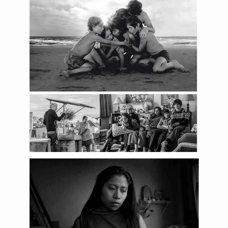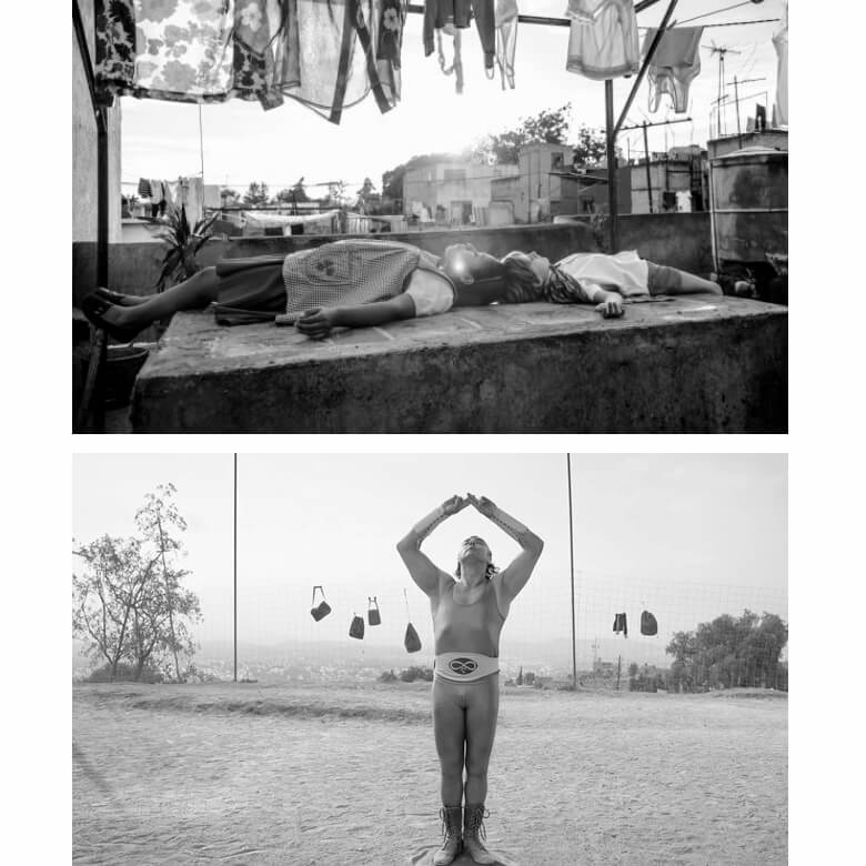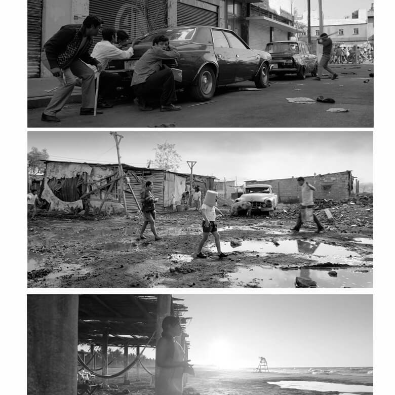 Желая как можно сильнее окунуть зрителя в атмосферу Мехико 70-х, режиссер идет на ход, который вряд ли мог себе позволить, выпуская картину в широкий прокат: он делает ее черно-белой. Монохромность изображения ничуть не вредит фильму. Убирая цветовые акценты, Куарон переводит внимание зрителей на события в кадре, позволяя убрать привычный для них слой смыслов. Что говорить, если даже собачье дерьмо становится у постановщика транслятором определенных идей, не сбиваясь в комичную пошлость.