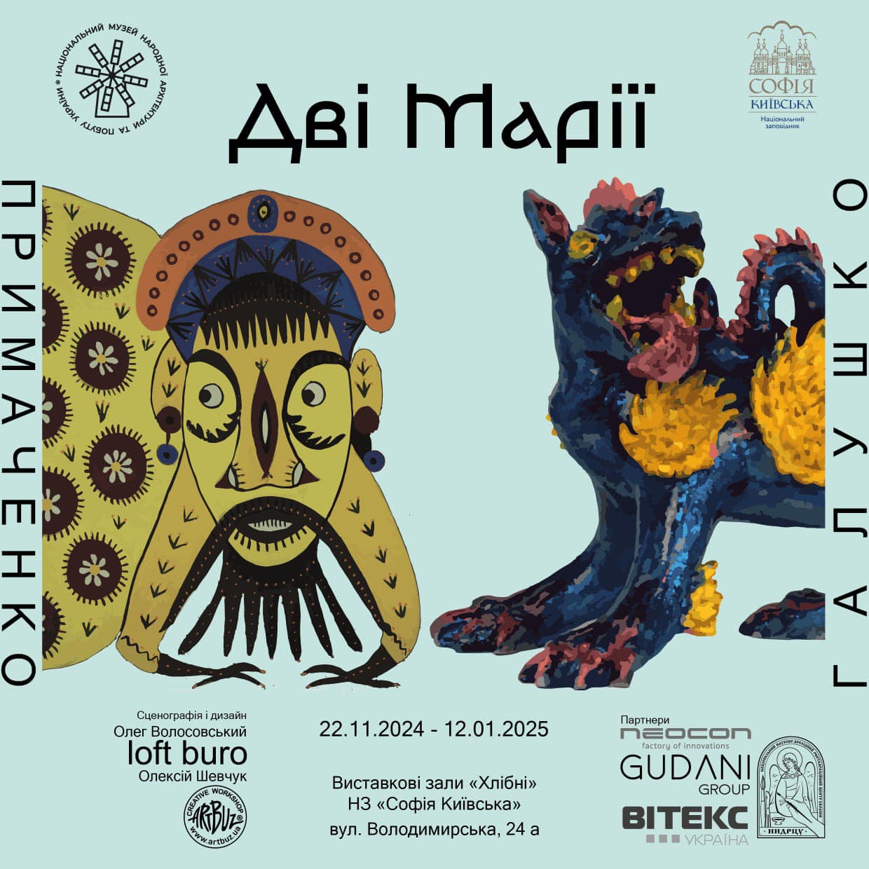 Виставка об’єднує роботи двох видатних українських художниць наївного мистецтва — Марії Примаченко та Марії Галушко. На ній представлені близько 100 робіт із фондової колекції Національного музею народної архітектури та побуту України, що раніше не були презентовані для широкого загалу. Це яскравий світ живопису Марії Примаченко з його фантастичними квітами й звірами, що доповнений анімалістичними керамічними скульптурами Марії Галушко.