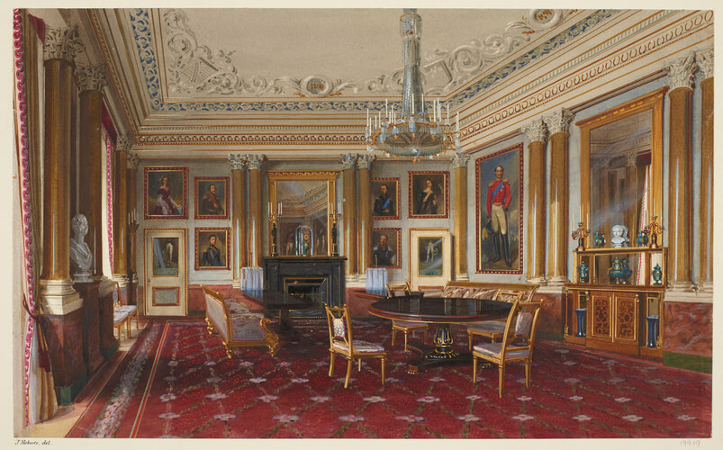 Здесь королева принимает высокопоставленных гостей — от культурных деятелей до представителей других королевских династий, устраивает званые ужины и записывает рождественские поздравления. Комнату назвали в память визита русского царя Николая I к королеве Виктории (во дворце также есть комната “1855”, где принимали Наполеона III).