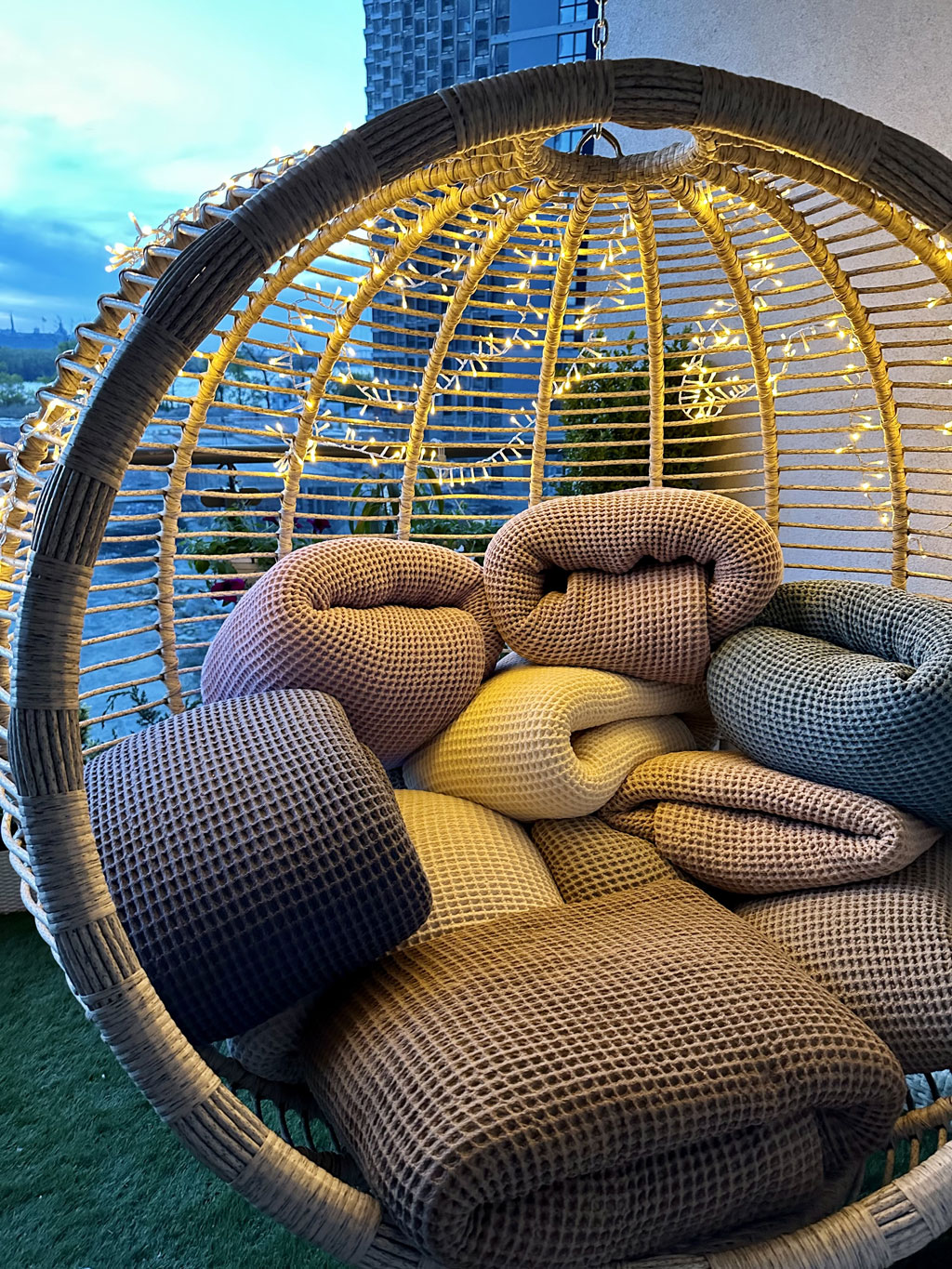 Халати, рушники та пледи-піке Dreamco виготовляються з текстурованої бавовни – це вафельне полотно нового покоління, яке виварюється за спеціальною технологією, після чого воно стає обʼємним та надзвичайно мʼяким.