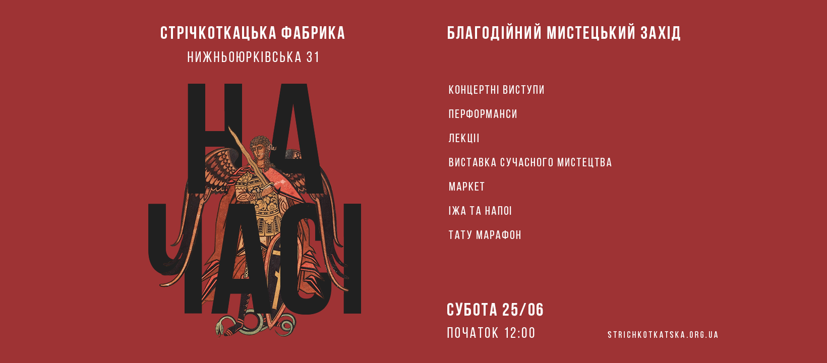25 червня в Києві відбудеться благодійний мистецький захід “На часі”, що має на меті зібрати кошти на підтримку творчих об'єднань Стрічкоткацької фабрики на Подолі. Також організатори хочуть підтримати українських митців та культурні простори, які зараз знаходяться у скрутному становищі.
