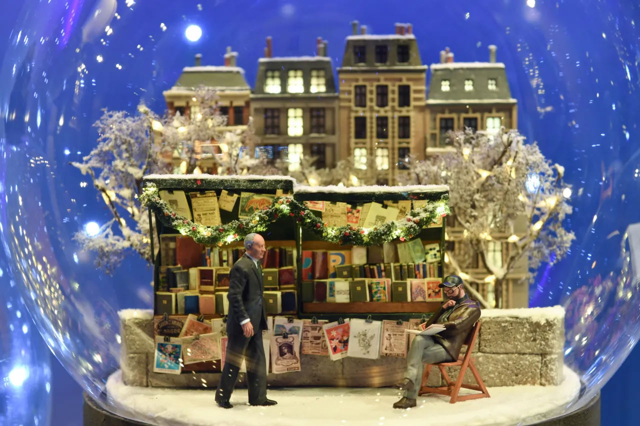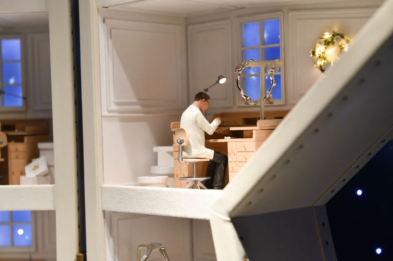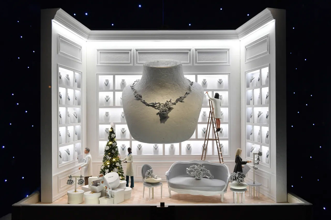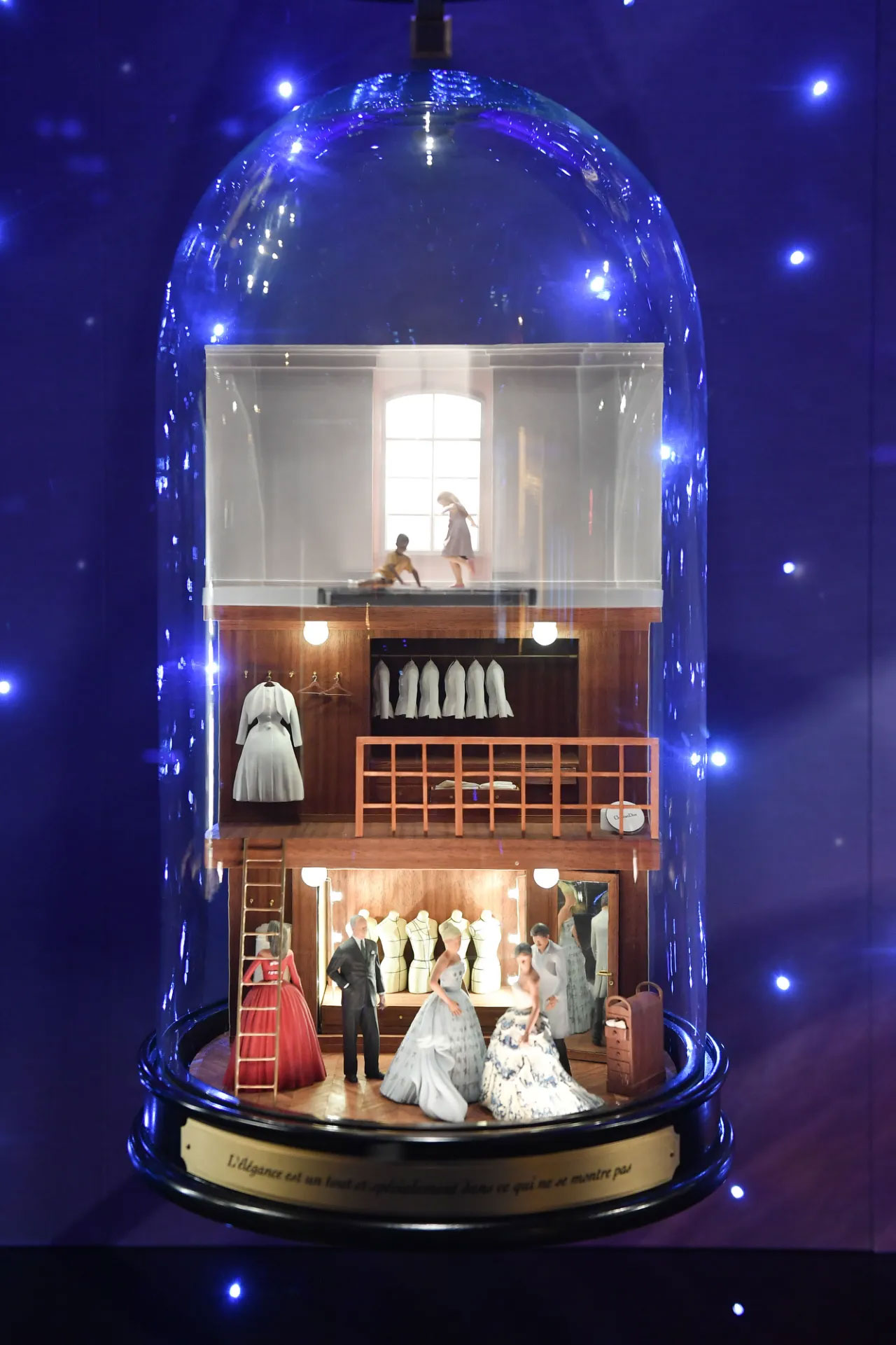У вітринах, під скляними куполами, Дім розмістив декорації з імпровізованими святковими сценами. Так, під дахом бутику Dior у вигляді жакету The Bar розігрався етюд новорічних свят у колі родини, а в іншому куполі лялькові персонажі обирали святкові наряди серед знакових суконь Дому.