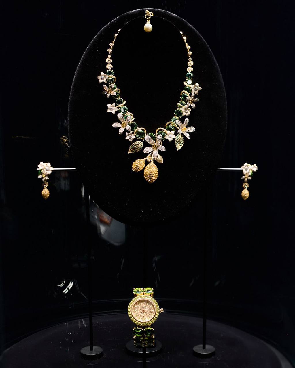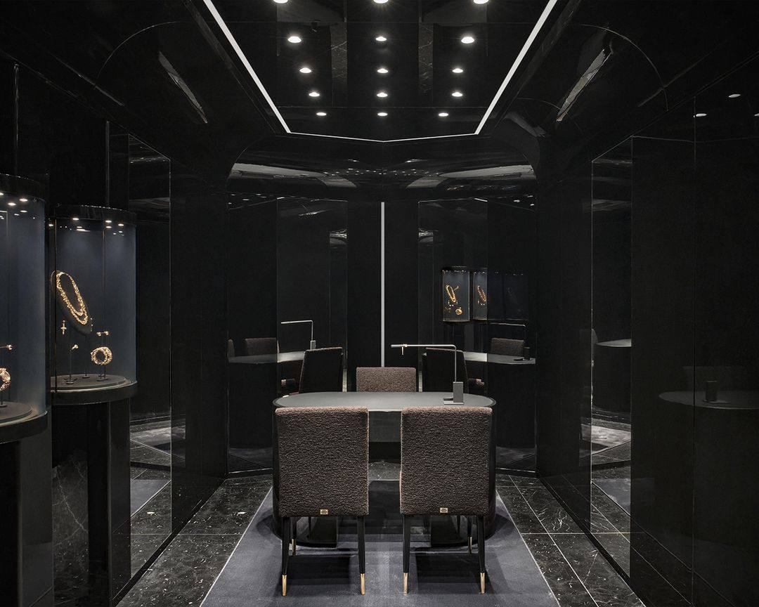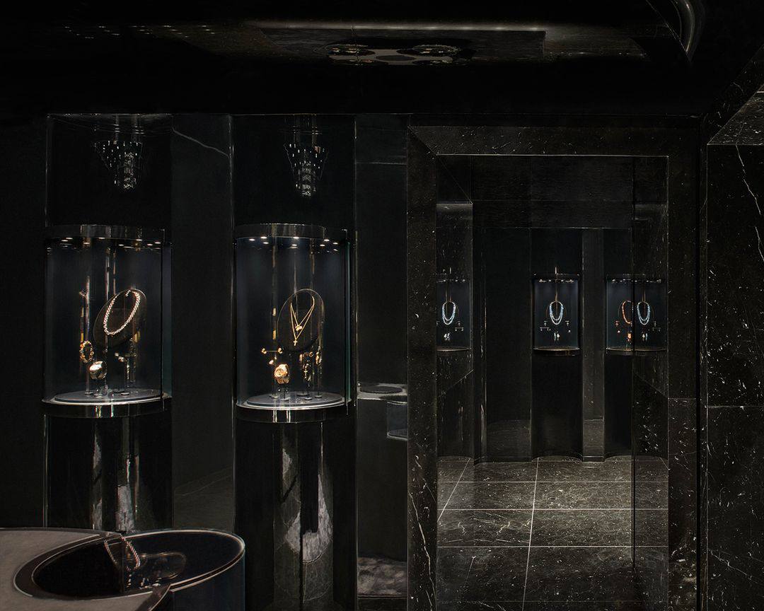 Інтер’єр бутику розділений на чотири зони та прикрашений великими дзеркалами, чорними вітринами з мармуру Black Marquina та дерева. Прикраси та годинники зберігаються в циліндричних вітринах, оздоблених склом і сталлю.