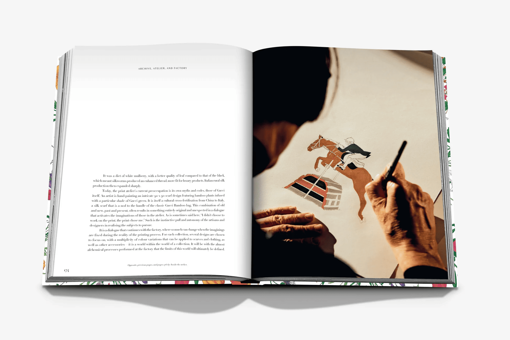 На інших сторінках Gucci: The Art of Silk читачі дізнаються про натхнення дизайнерів Дому епохою Відродження та Флоренцією, бажання сім’ї Гуччі стати новою родиною Медічі, процес створення шовкових хусток та людей, які стоять за їх виготовленням, улюблені аксесуари Єлизавети II та інших монарших.