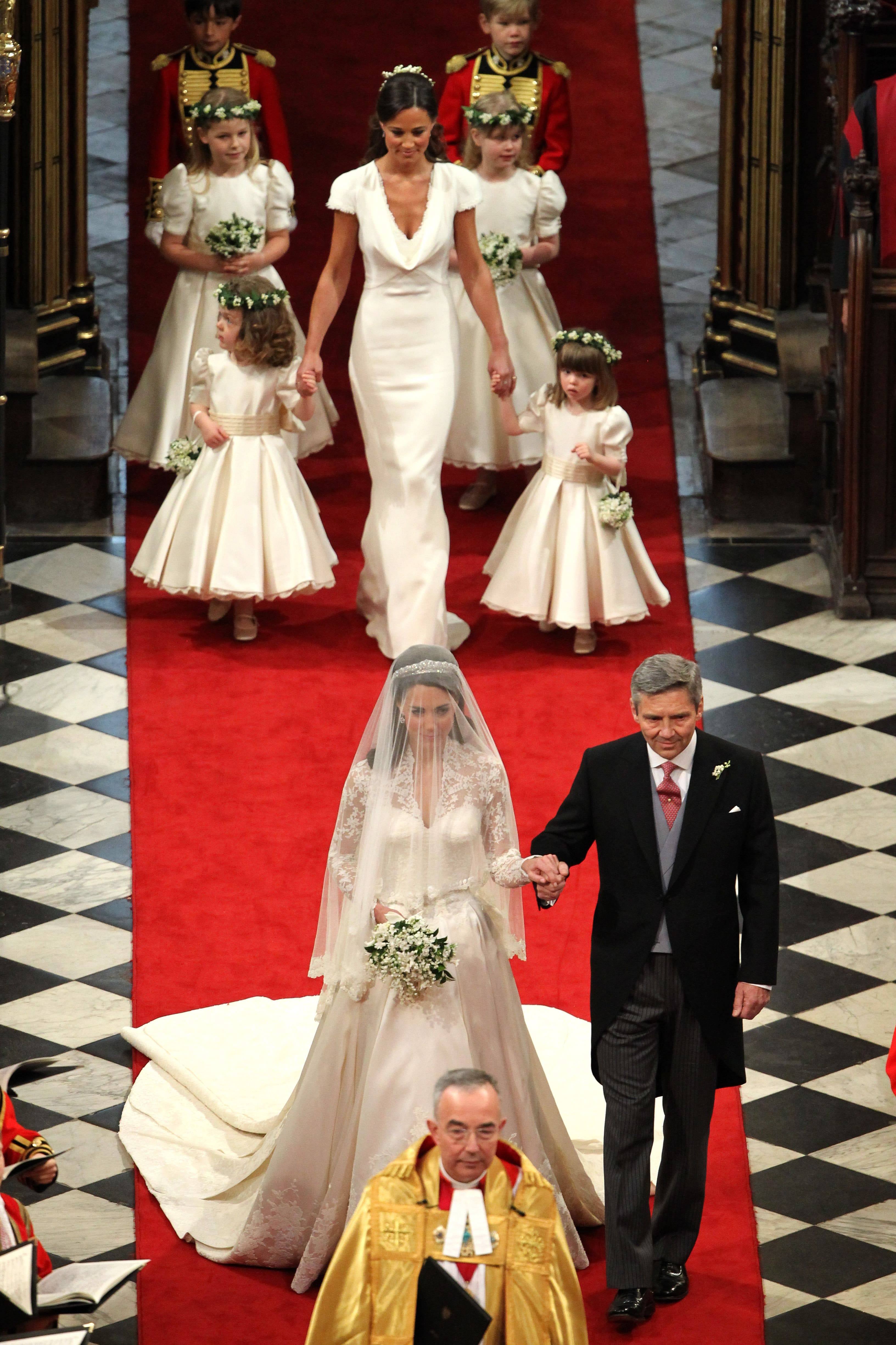 У невесты Кейт Миддлтон на свадьбе было два платья. И оба — дизайна Сары Бертон, креативного директора дома Alexander McQueen. Рукава и лиф свадебного платья были расшиты кружевными трилистниками – цветами-символами Великобритании. Платье цвета слоновой кости дополнял шлейф длиной 2,7 метра, а голову невесты украшала бриллиантовая тиара Cartier Halo, одолженная ей на свадьбу королевой Елизаветой II. Тиару из 739 бриллиантов и 149 алмазов создали по заказу короля Георга IV в 1936 году для его жены, матери королевы Елизаветы II – Елизаветы Боуз-Лайон.