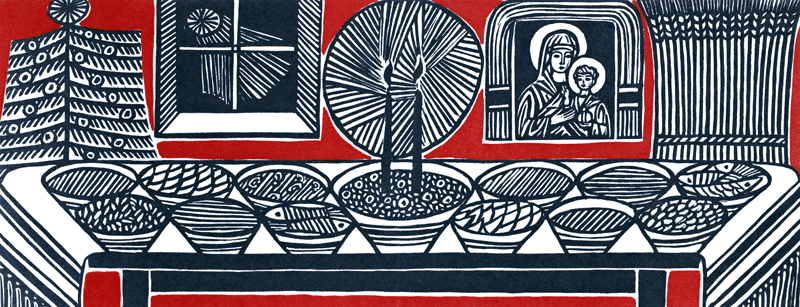 На Святвечір, з 24 на 25 грудня, готується 12 пісних страв, кількість яких відповідає кількості календарних місяців. Головною стравою є багата кутя, що готується з пшениці чи ячменю. По кутах столу кладеться часник як оберіг, а родина сідає за вечерю зі святковою молитвою після сходження першої зірки на небі – символу народження Христа.