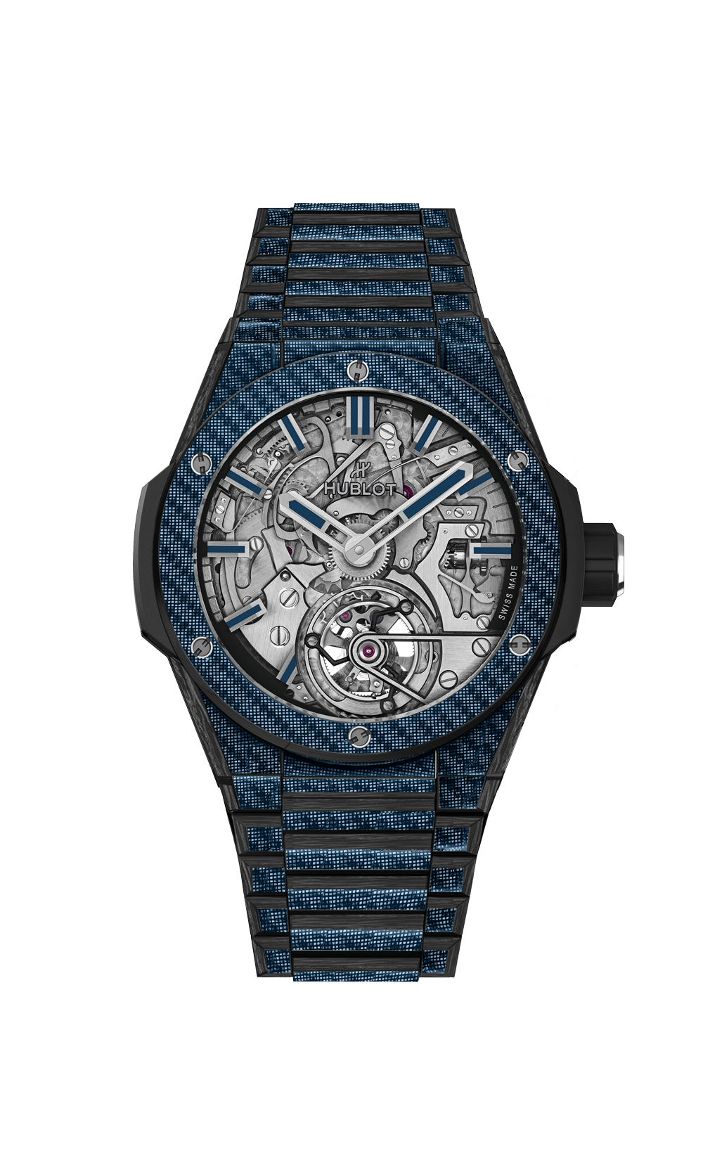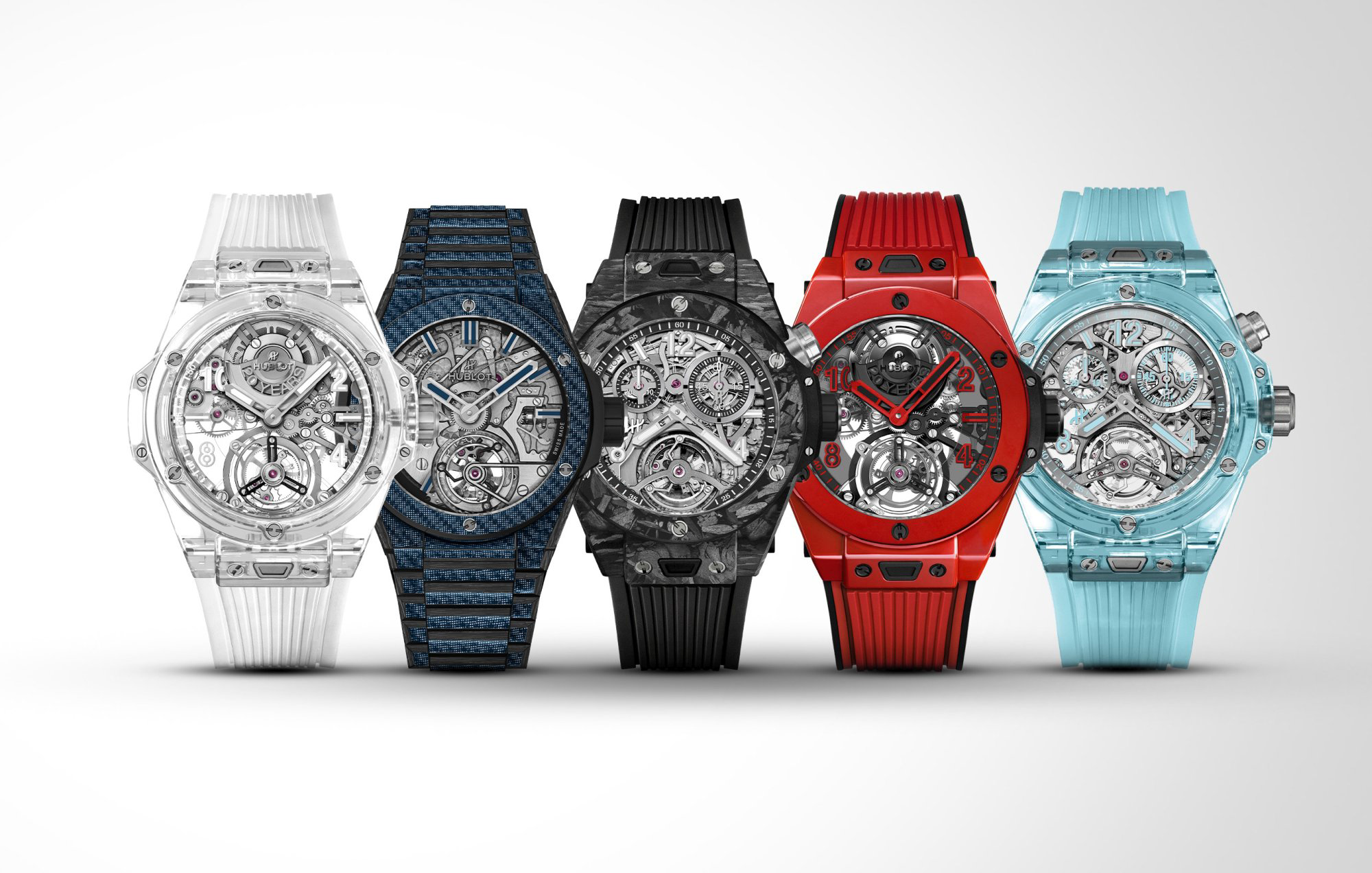 Tourbillon Automatic Sapphire — повністю прозорий корпус із сапфіру, механізм HUB6035 із мікроротором із білого золота. Red Magic — аналогічна конфігурація в червоній кераміці. Water Blue Sapphire — монопушер-хронограф із ручним заведенням та 115-годинним запасом ходу. Cathedral Minute Repeater — турбійон і хвилинний репетир із корпусом із матового вуглецю. Blue Texalium — унікальний корпус і браслет із карбонового композиту з інтенсивним синім тоном, з інтегрованим репетиром.