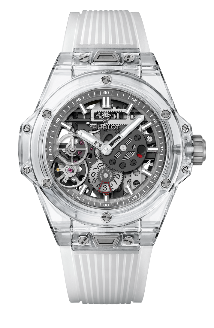 Механізм HUB1201 — ручний калібр зі скелетонізованою конструкцією, 10-денним запасом ходу і лінійною системою індикації "crémaillère" — створений для максимальної відкритості й архітектурної виразності. Усі годинники мають ремінці з прозорого силікону в тон корпусу.