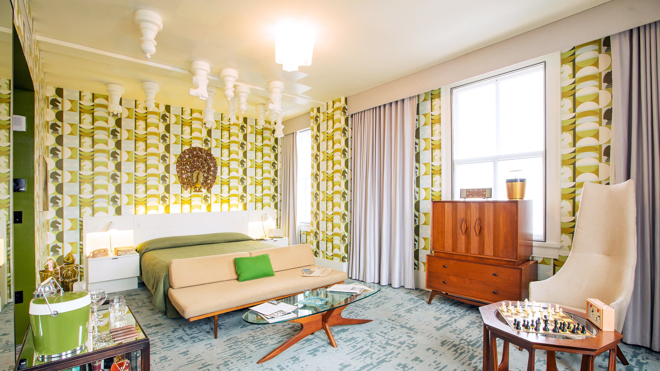 Декор номера создали дизайнер Изабель Лэдд, основательница Лексингтонской лиги дизайна середины века, Люси Джонс и Алекс К. Мэйсон из Ferrick Mason Inc. Они разработали уникальный геометрический рисунок обоев для комнаты, на которых нанесены шахматные фигуры коня различных оттенков зеленого.