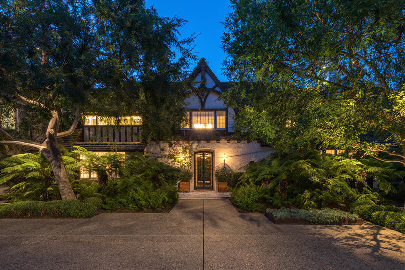 Двухэтажная вилла площадью 1115 квадратных метров сочетает в себе классику золотой эры Голливуда и современный минимализм. Чистые линии, панорамные окна и светлые оттенки в интерьере контрастируют с темными полами из дерева.