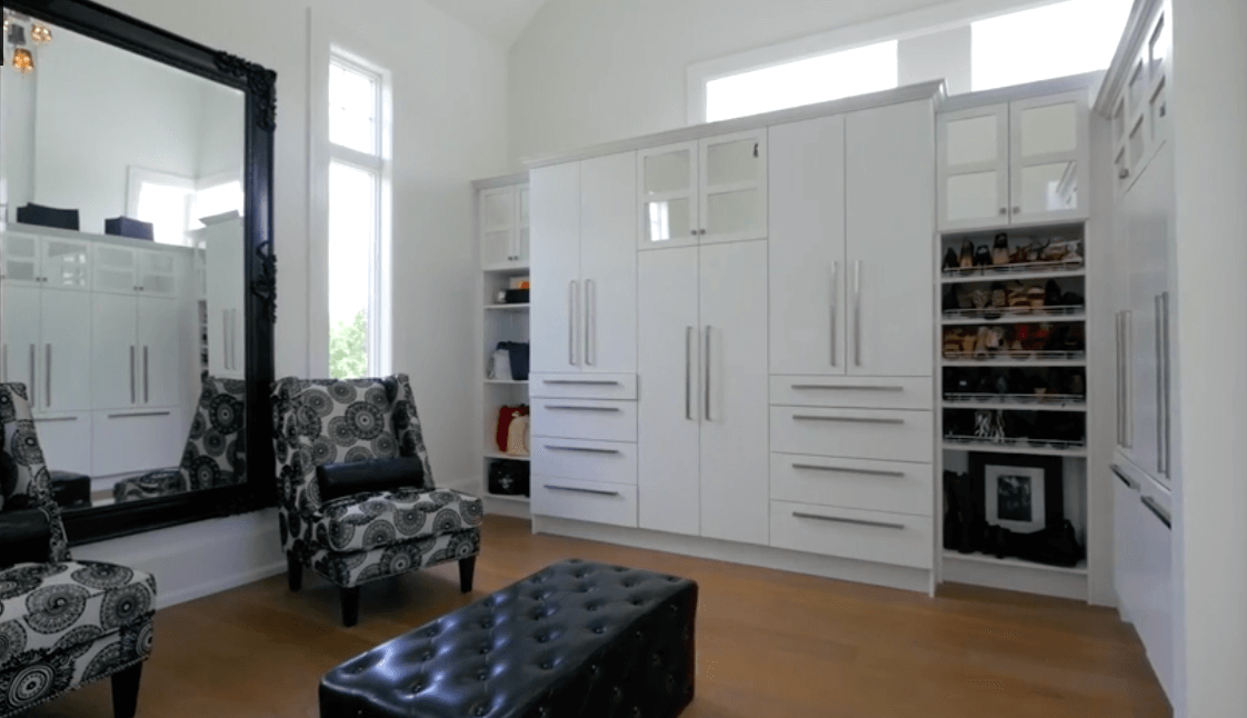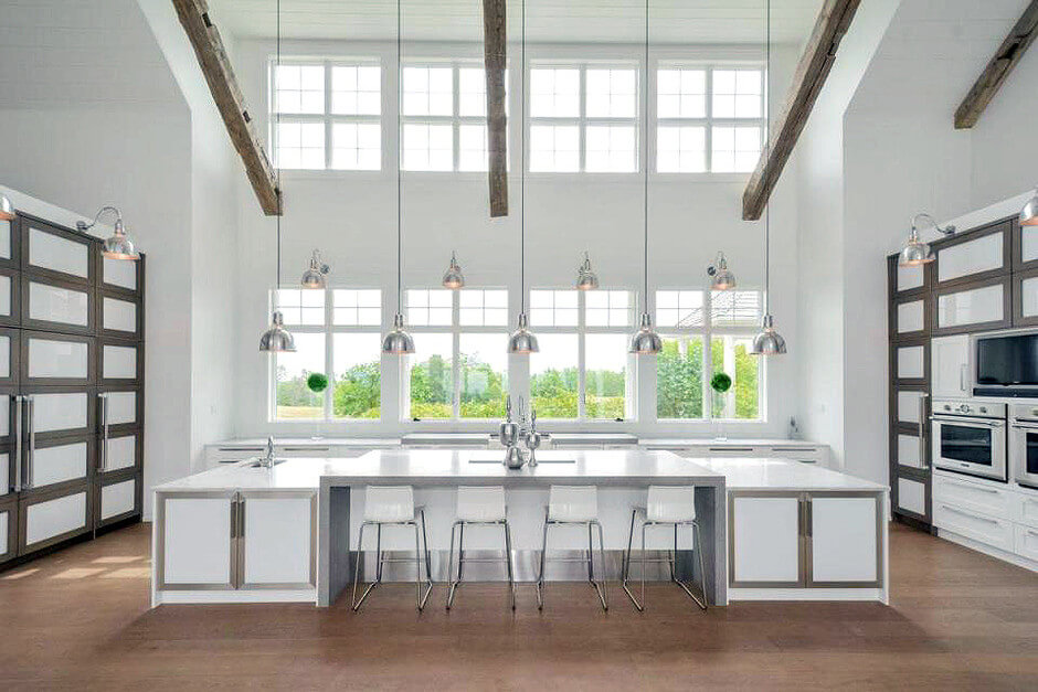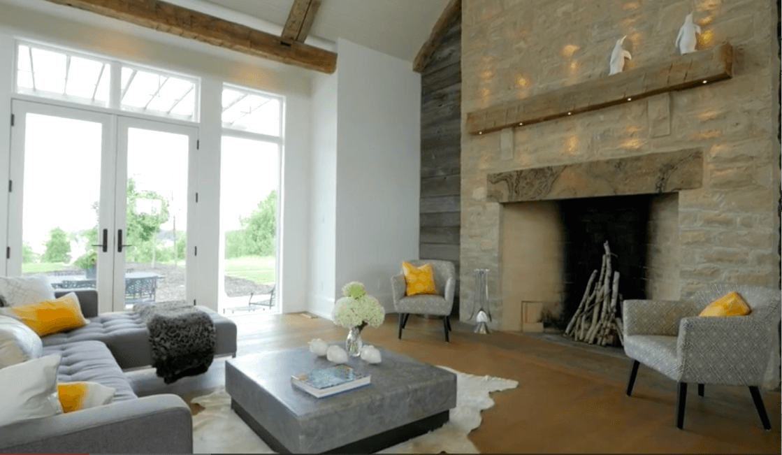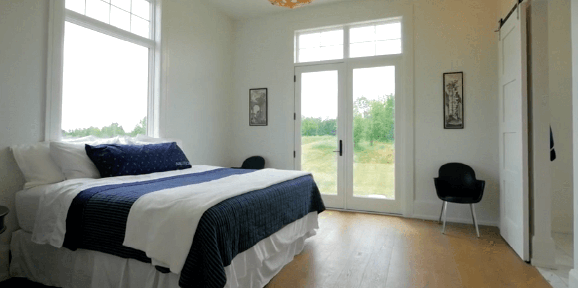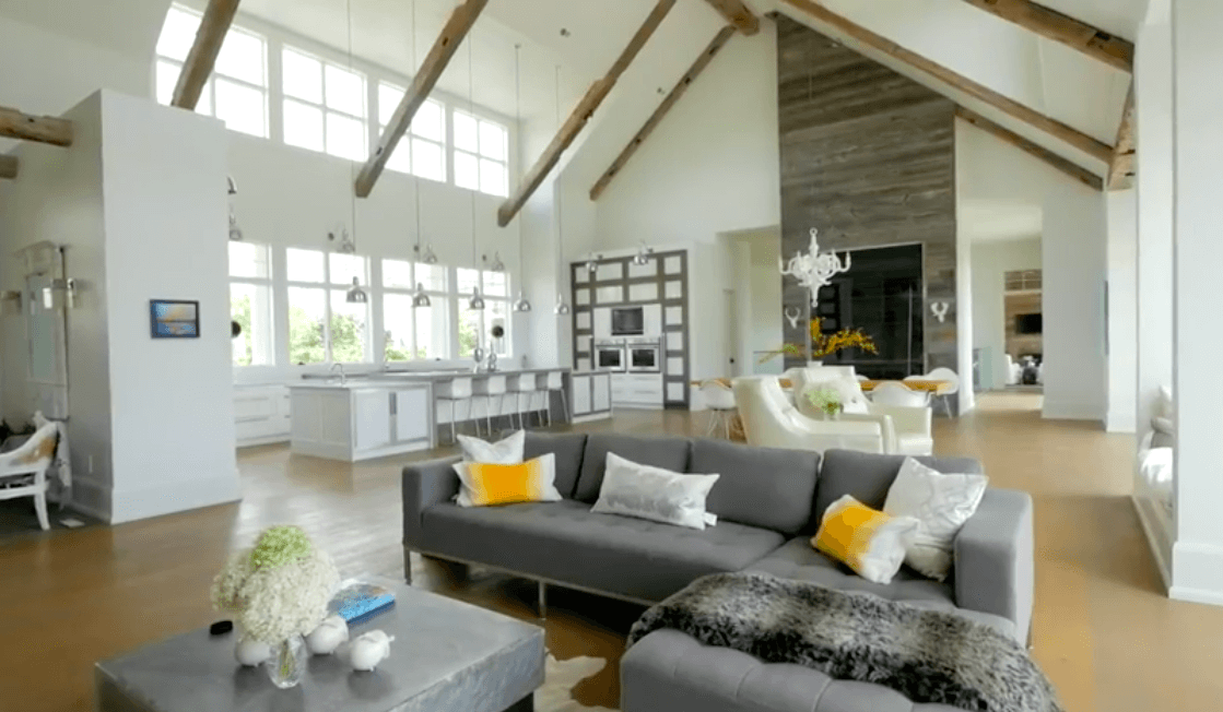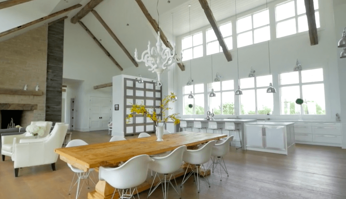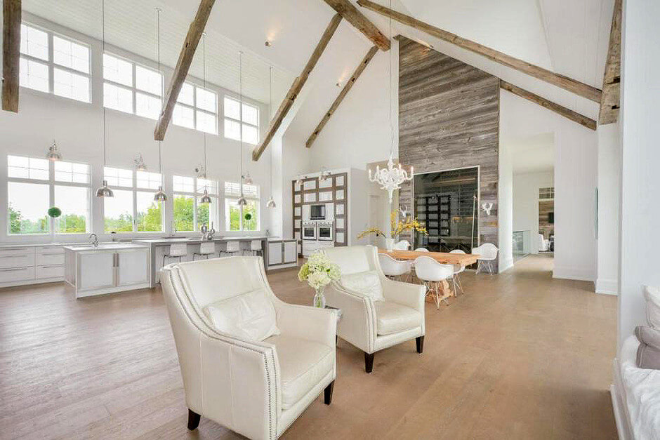 В доме площадью 836 квадратных метров — 5 спален, просторная гостиная с камином и современная кухня открытой планировки. Классическую канадскую ферму модернизировали в соответствии с последними трендами: теперь в доме есть панорамные окна, теплый пол для канадских зим и простой интерьер с белыми стенами и деревянными балками в потолке. В подвальном этаже обустроили домашний кинотеатр, бильярдную, винный погреб и тренажерный зал.