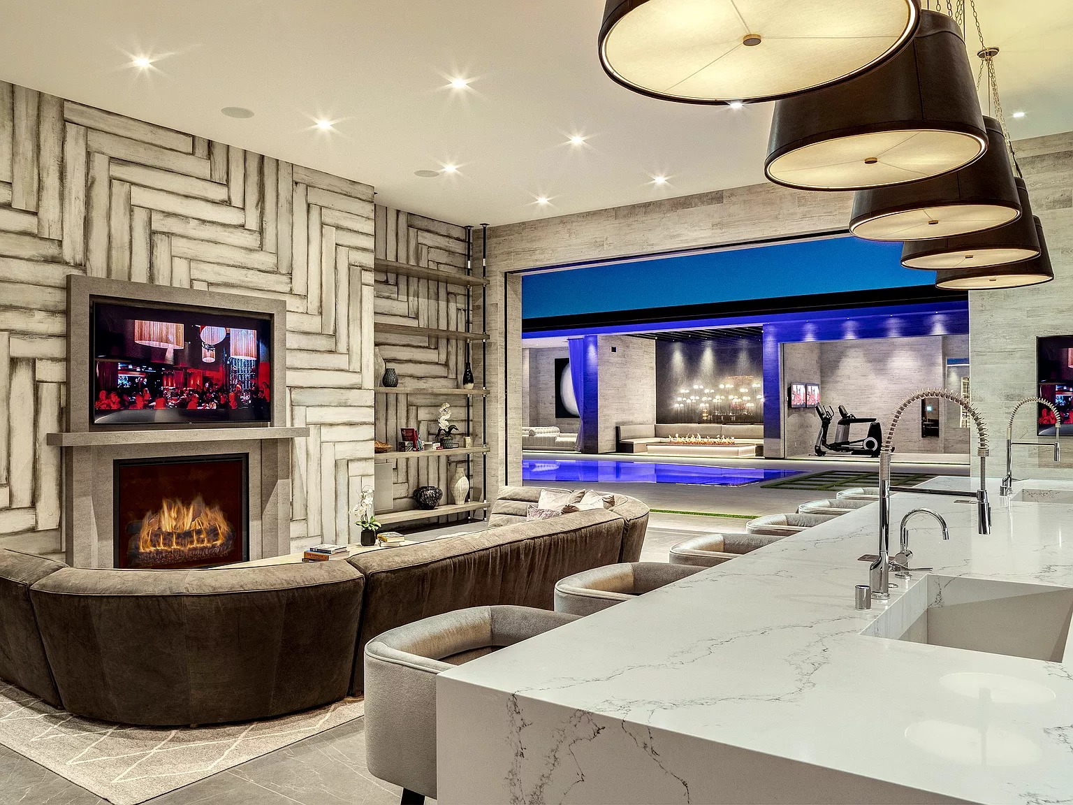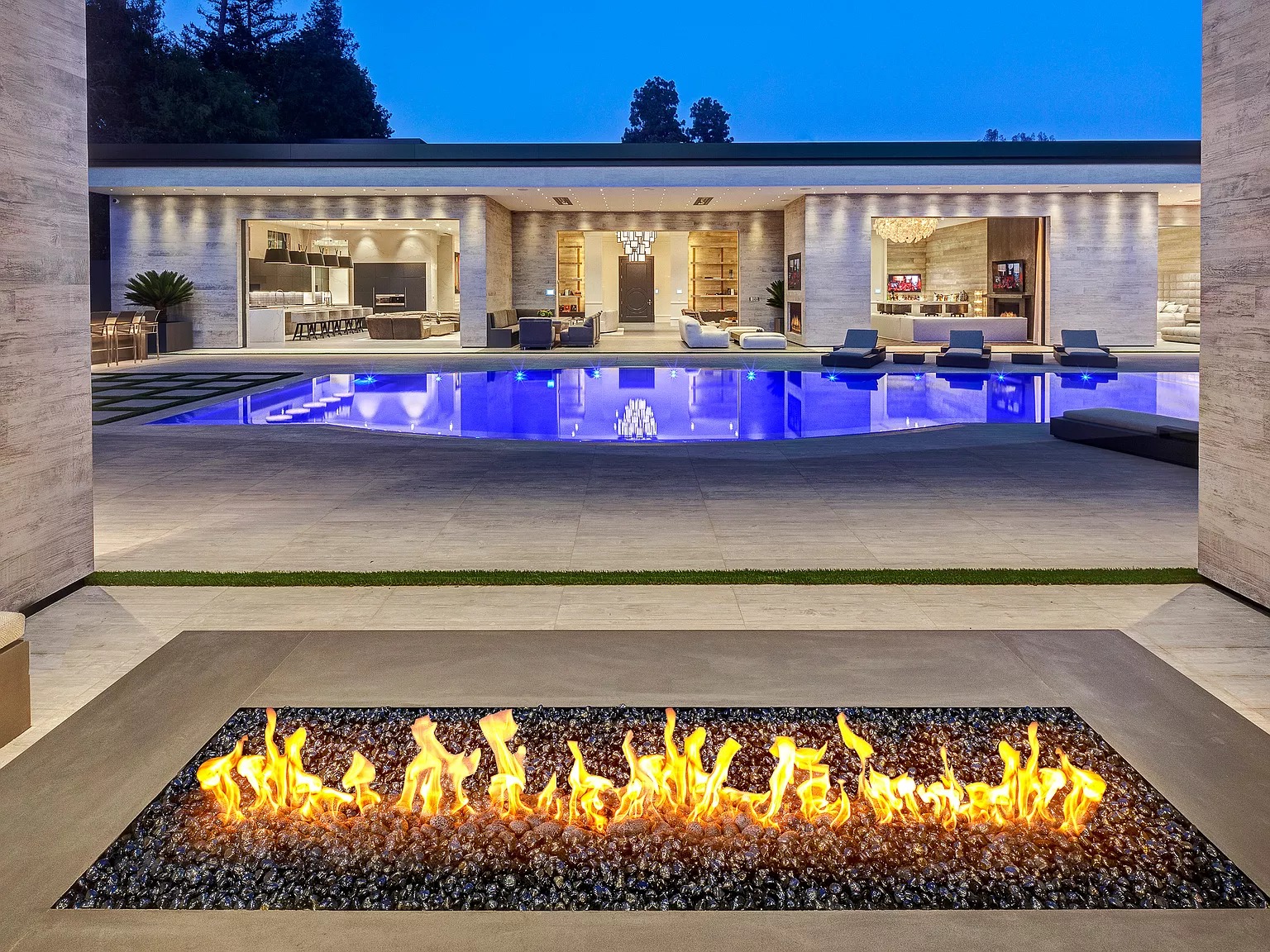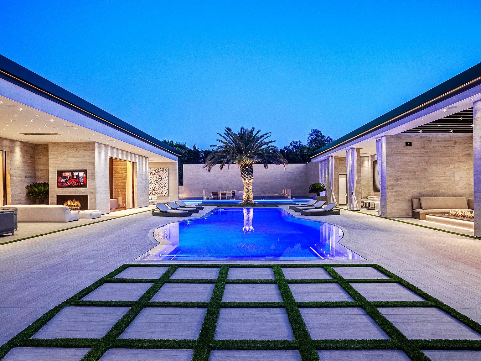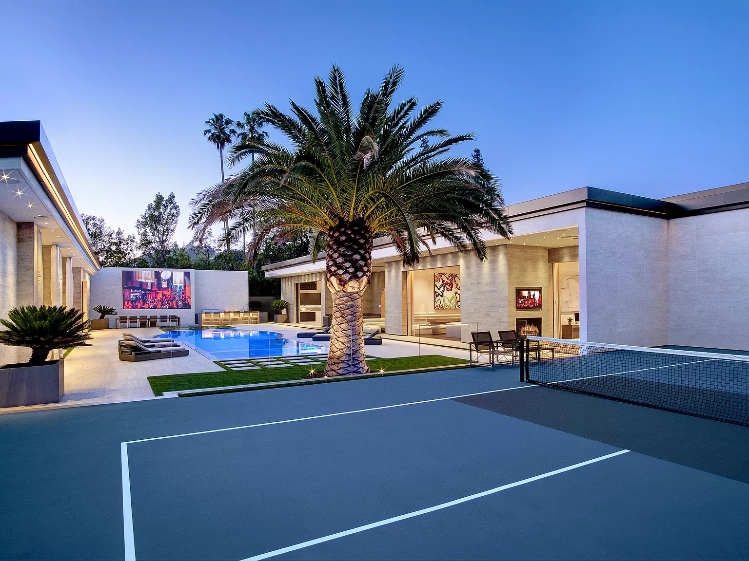 В одноэтажном здании в современном стиле есть спальня, кухня, проекционный экран под открытым небом, домашний кинотеатр, бары и игровые комнаты, бассейн, тренажерный зал и спортивная баскетбольная площадка.