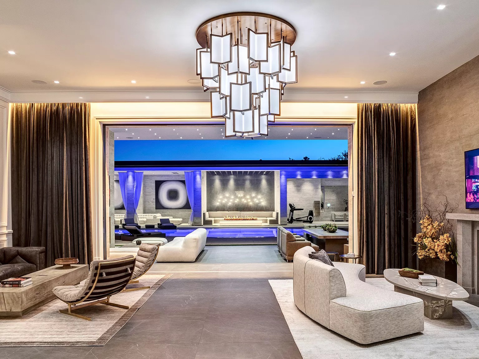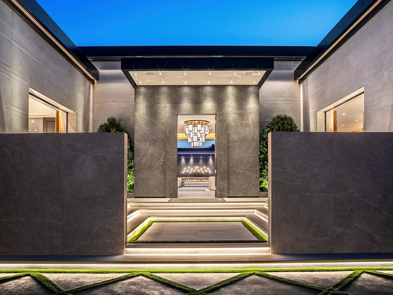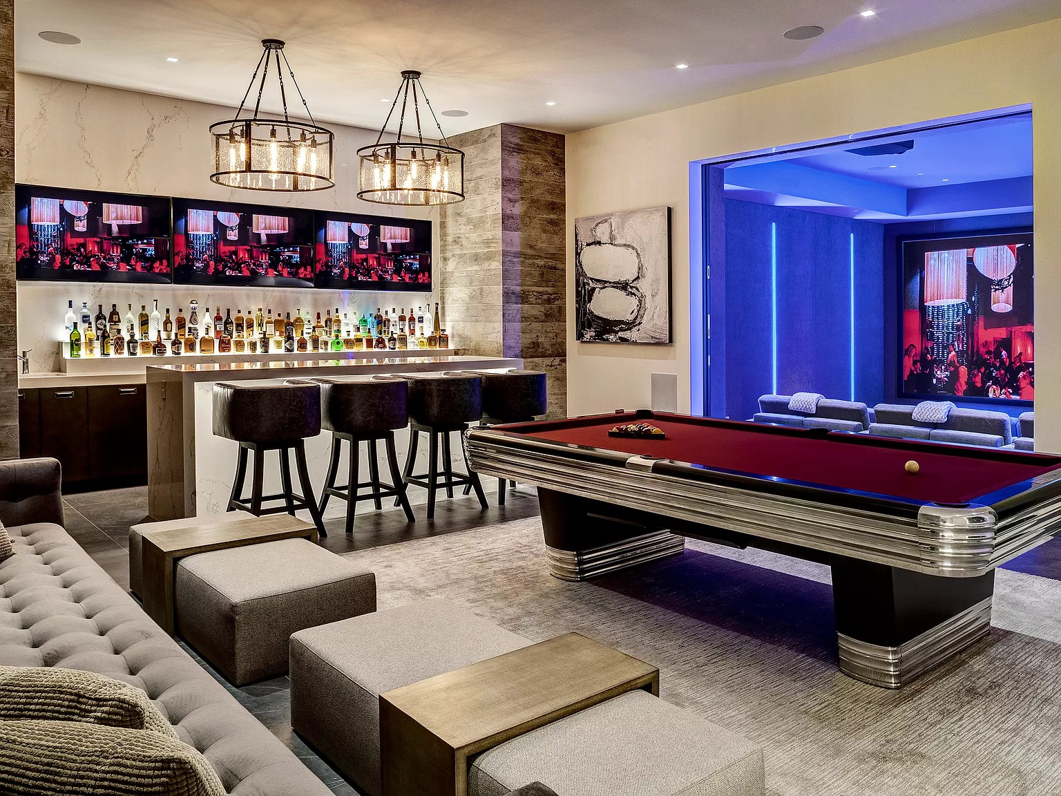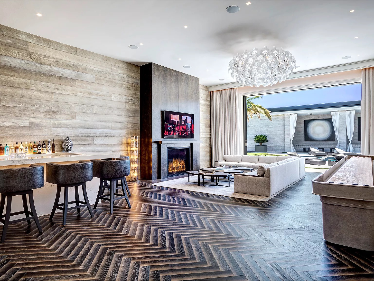 В одноэтажном здании в современном стиле есть спальня, кухня, проекционный экран под открытым небом, домашний кинотеатр, бары и игровые комнаты, бассейн, тренажерный зал и спортивная баскетбольная площадка.