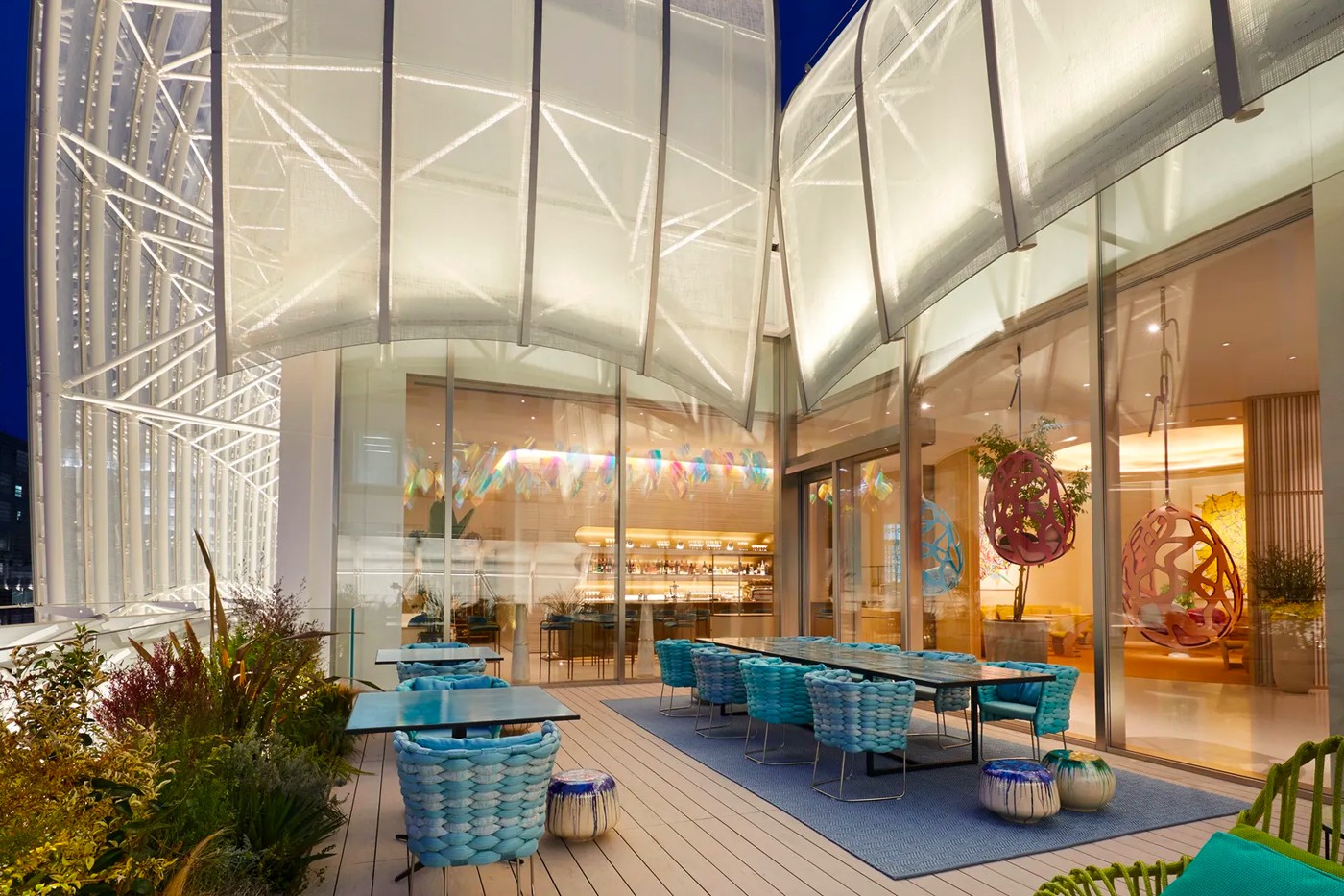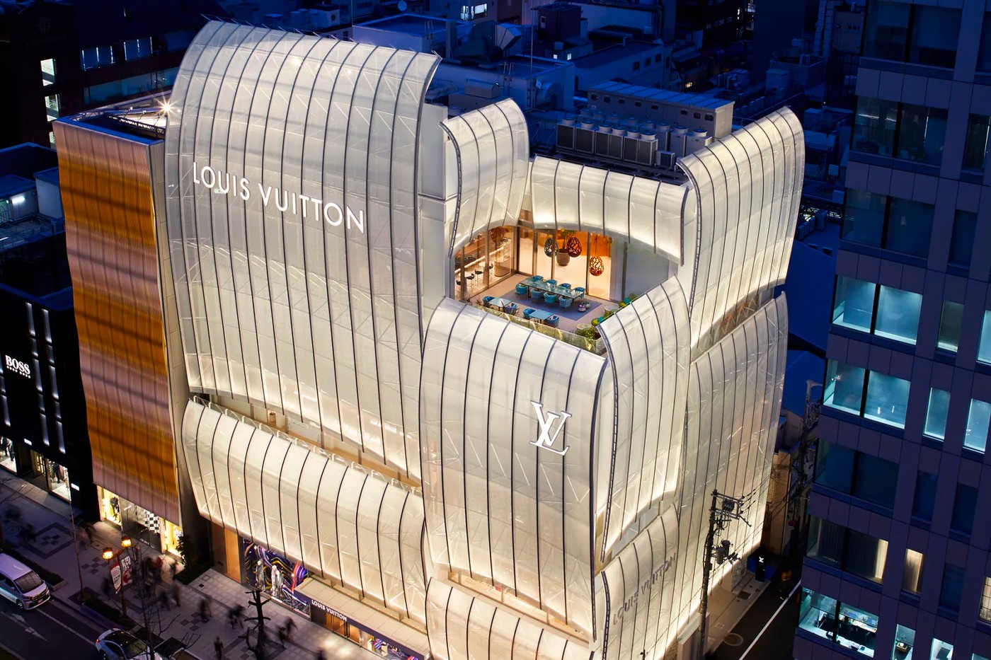 Le Café V находится на верхнем, 4-м, этаже бутика Louis Vuitton, где коктейли будут подавать клиентам на открытой террасе. Ресторан Sugalabo V будет работать только в вечернее время.