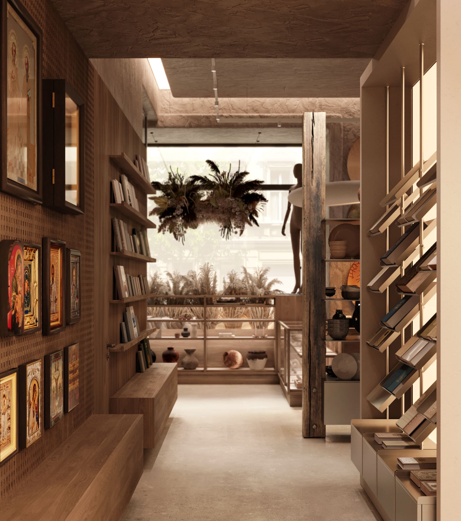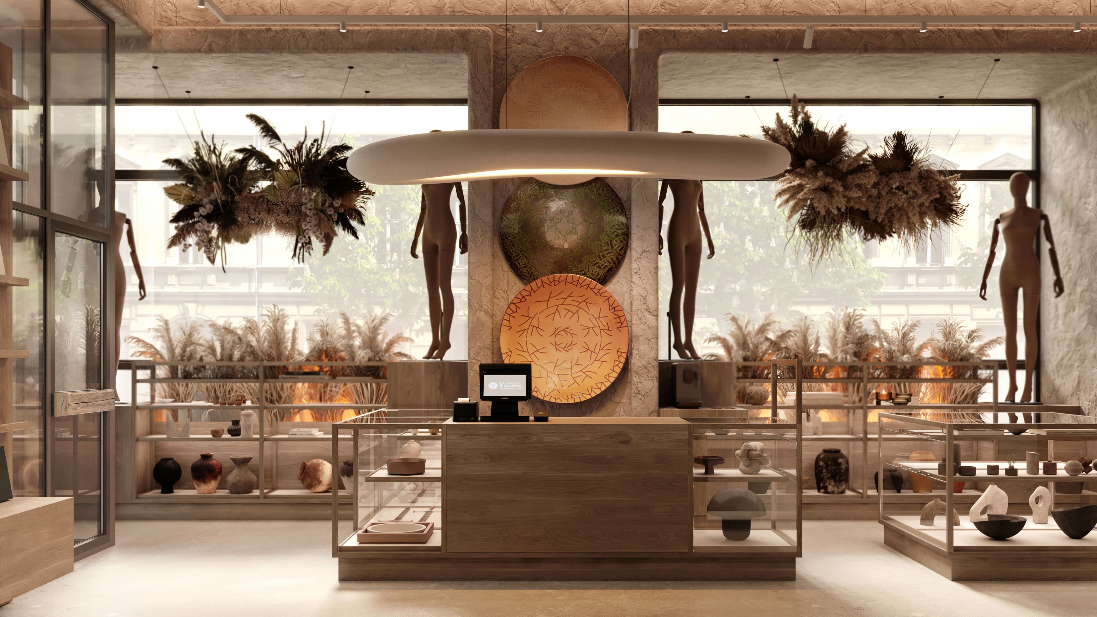 «З самого початку нашим головним завданням було створити не просто місце для автентичного традиційного українського мистецтва. Безпосередньо простір транслював цю ідею та сенси, будучи головним елементом концепції Народного Дому. Навіть без експонатів та виробів на вітринах. Простір, де сутність української традиції, яка відображається у матеріалах, деталях та принципах декорування, знаходить сучасну форму у вигляді мінімалізму та функціоналізму, згідно нашого фірмового артстилю», — розповідають редакції L’Officiel у MAKHNO.