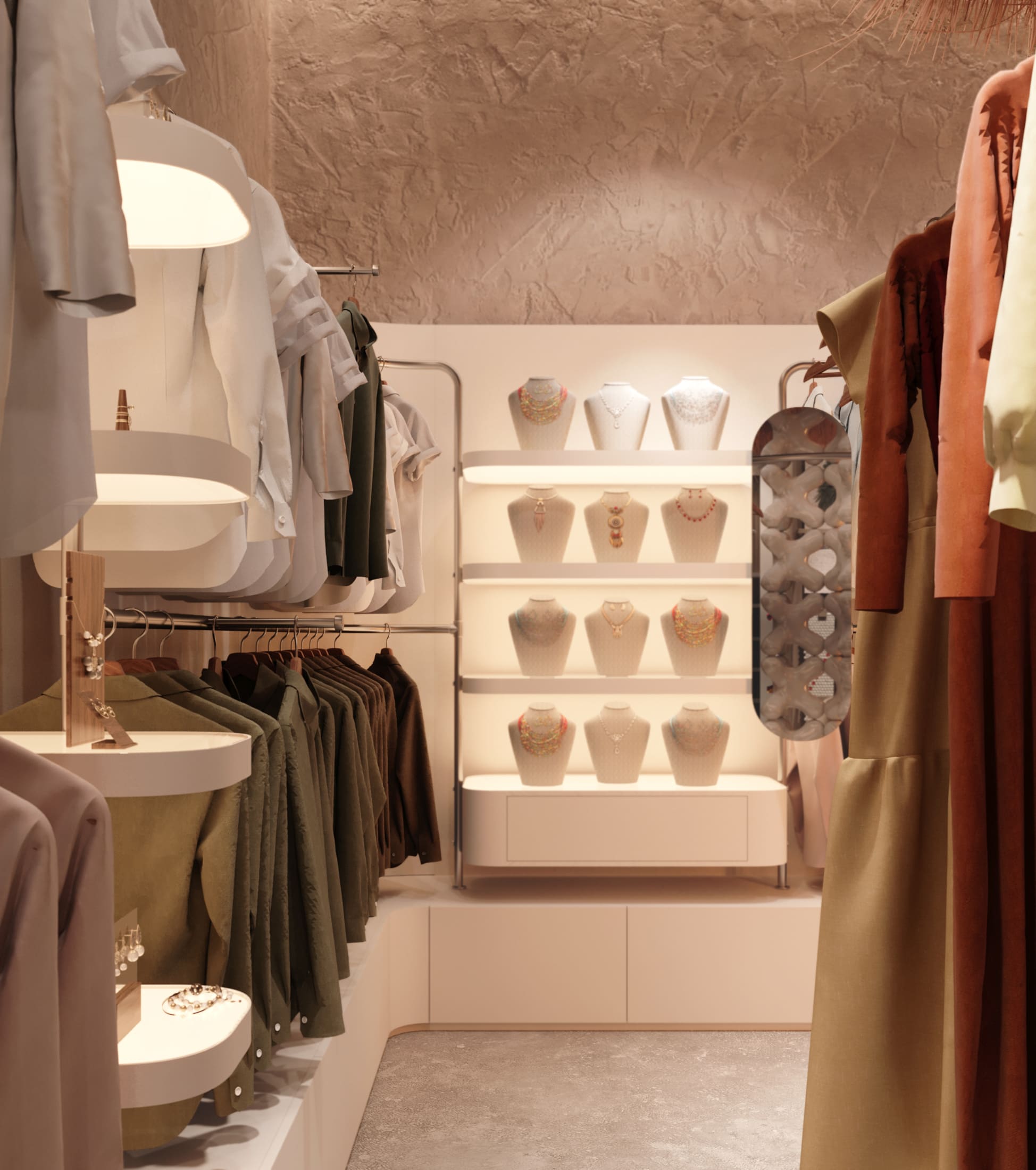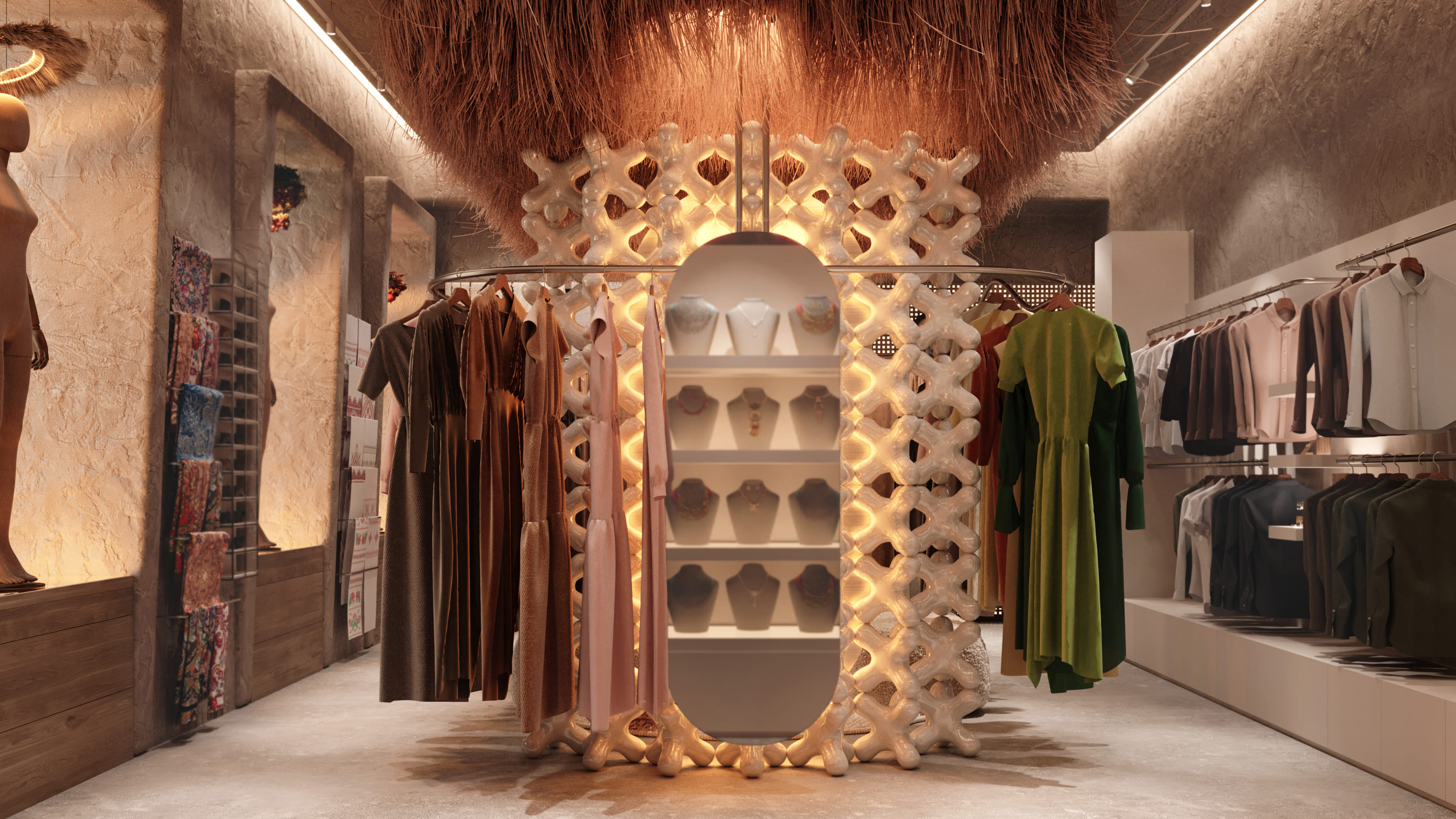 «Основні матеріали — це глина та дерево. Обидва природні, обидва — з давніх давен є основою української оселі. Стіни оздоблені декоративною штукатуркою під мазанку та керамічною 3D-артплиткою TETRAPOD в зоні примірочних. Вінтажна деревина зі старих балок з українських хат стала основою конструктивів полиць. Також у просторі багато дерев’яних панелей, ящиків, розсувних конструкцій та елементів декору», — коментує студія.