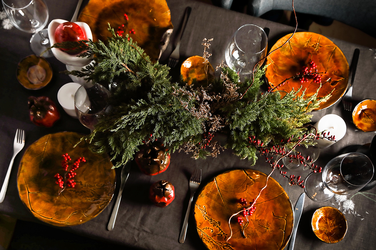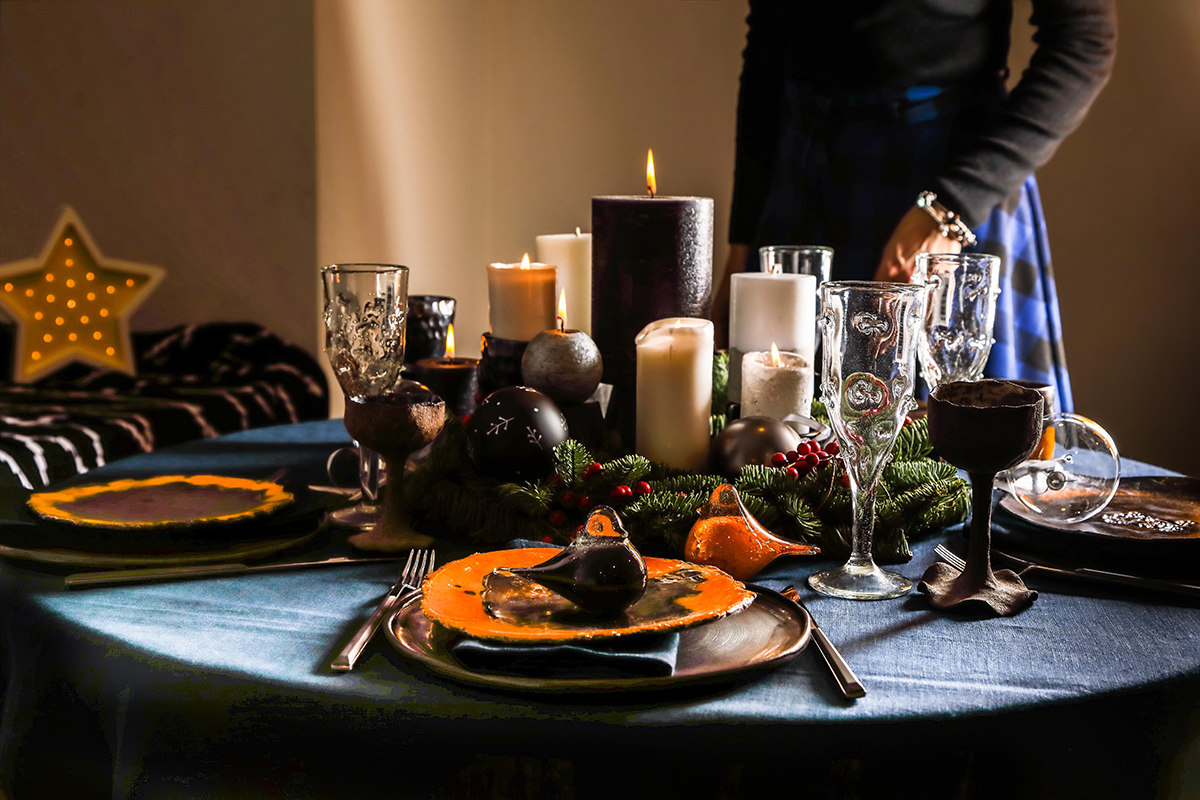 Свічки ArtFyou, скляні пташки, келихи, новорічні іграшки "Щось Цікаве", тарілки Art Room Ceramics та "Восьма комора", чорні келихи Yuriy Musatov, лляна скатертина та серветки Moon Linen