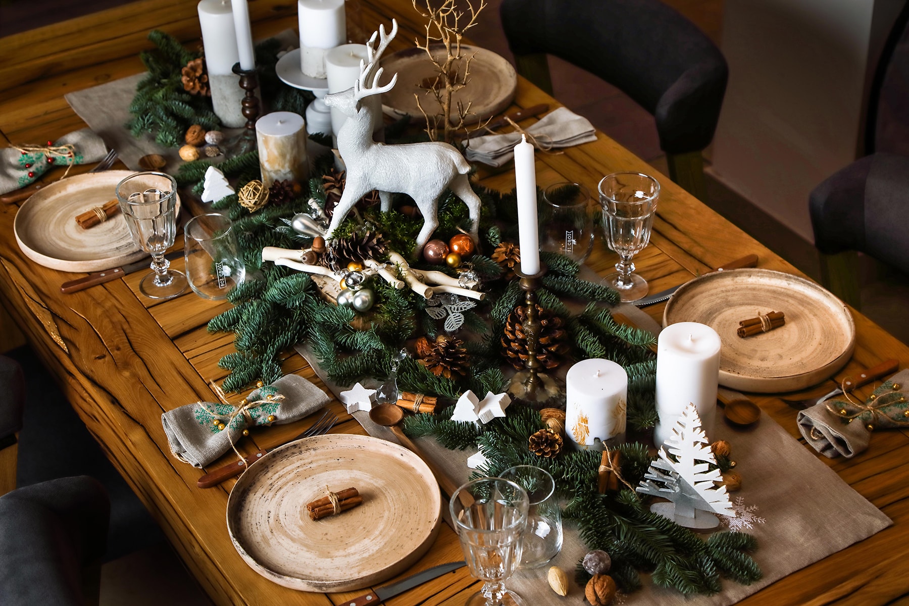 Якщо у вас вдома є дерев’яний стіл – це гарний початок. Не закривайте його природну красу скатертиною, краще використайте лляний ранер. Він стане центром композиції, де й розміститься основний декор. Гілочки сосни чи ялини, яблука, апельсини чи гранати, шишки чи горіхи, палички кориці, грона калини чи шипшини – для декору в стилі natural підійде практично все. До ранера підберіть серветки з льону – перев’язавши їх джутовою мотузкою, отримаєте красивий акцент. Сервіруючи стіл, намагайтесь підібрати усі предмети в одній кольоровій гамі – до текстилю з нефарбованого льону додайте керамічні тарілки з тонкими тріщинками-кракле, дерев’яні ложки, фігурки ялинки, зірочок чи оленя.