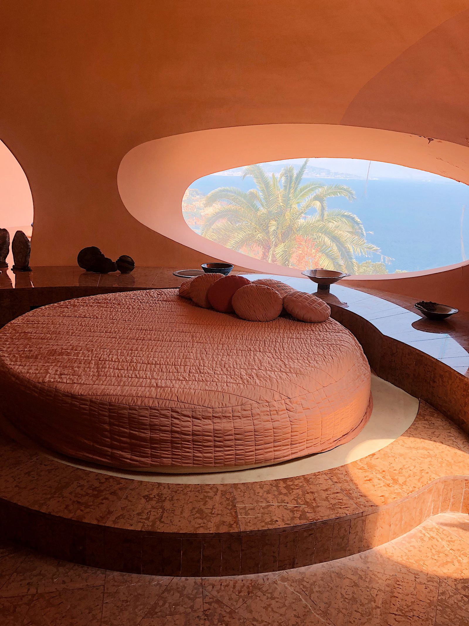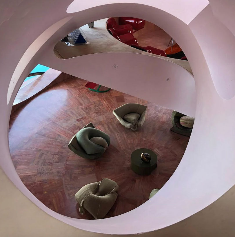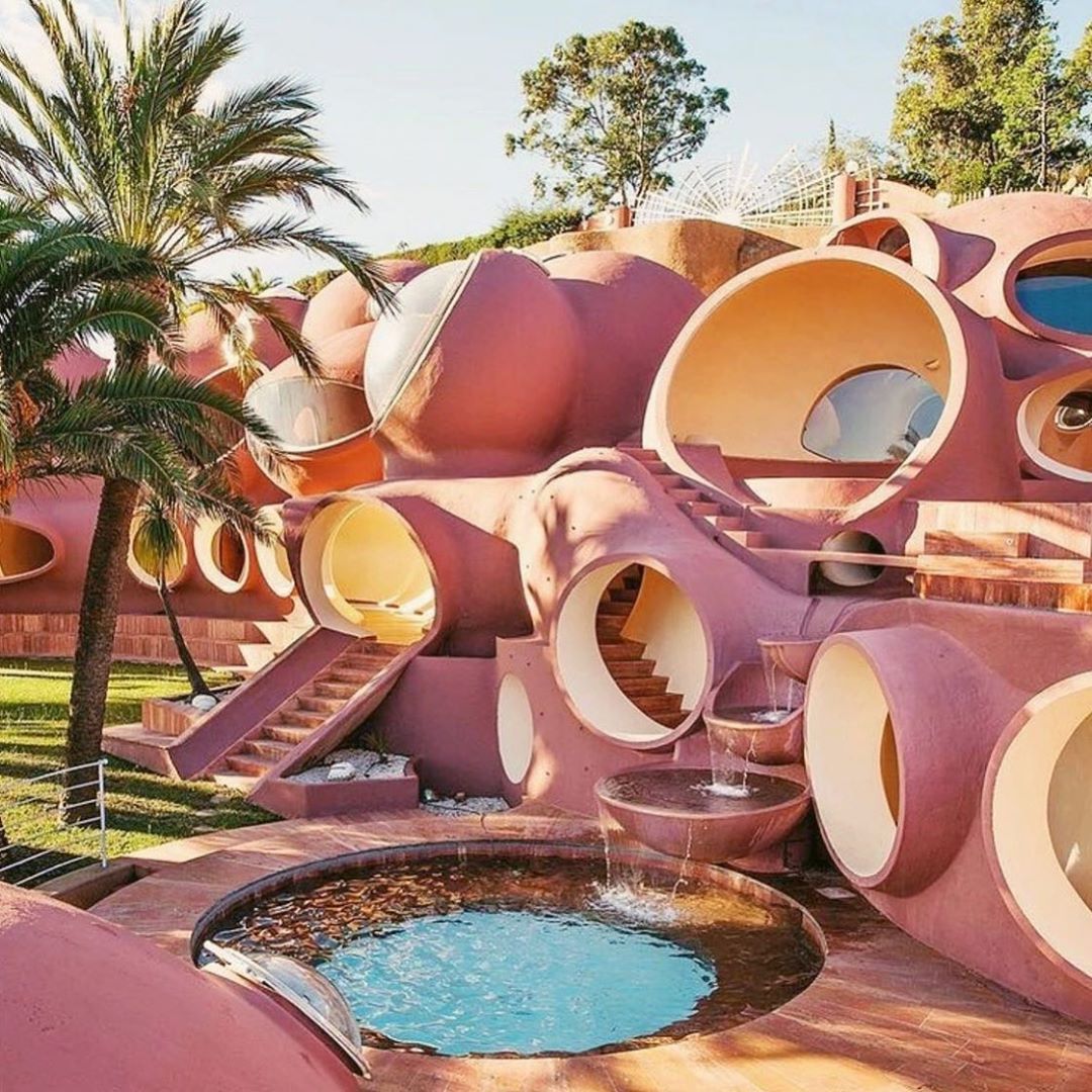 Дом был спроектирован так, что напоминает сборку модулей пузырей, между которыми расположены террасы и бассейны. В каждом модуле есть большие круглые отверстия, через которые внутрь проникает солнечный свет.