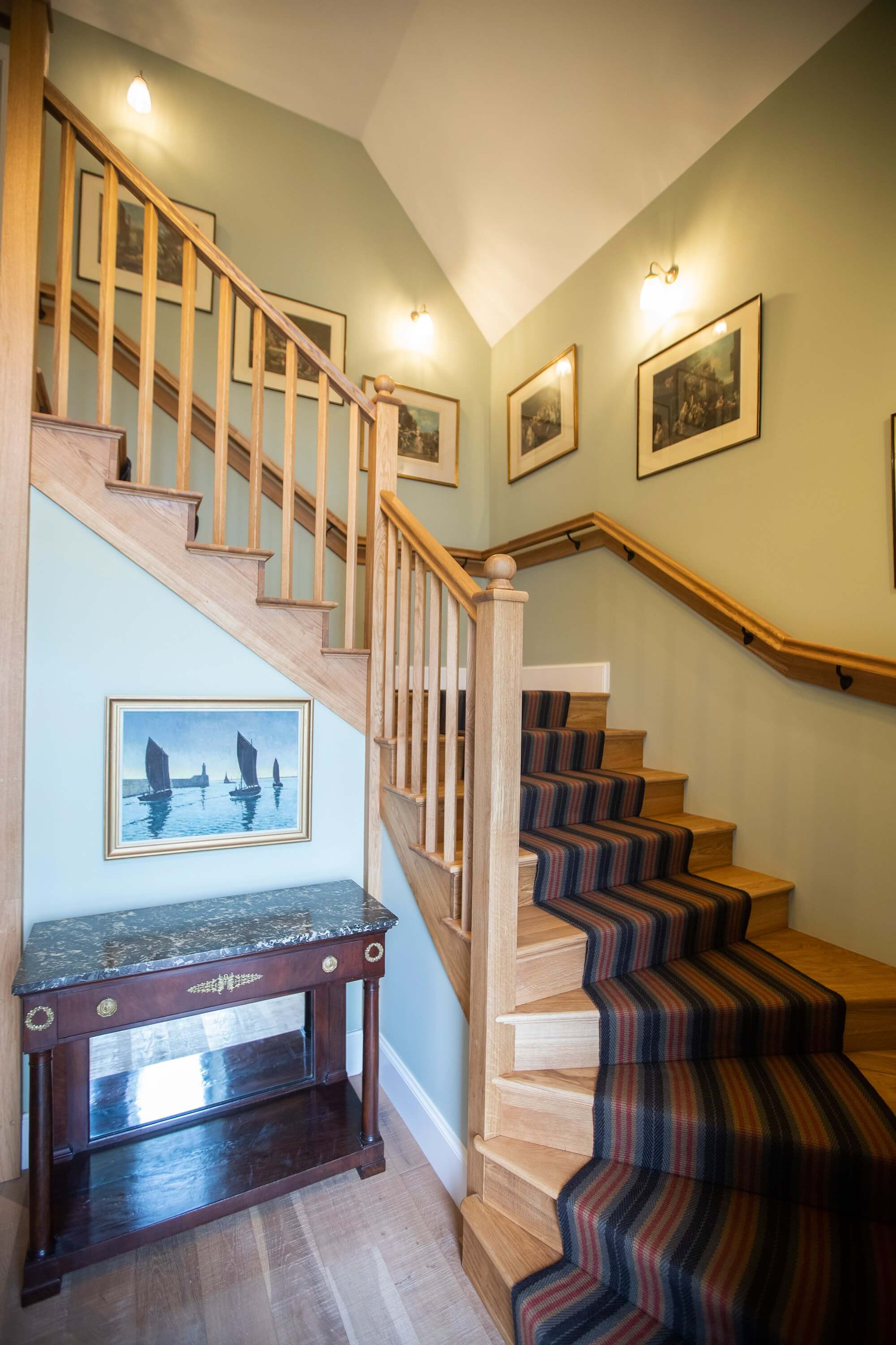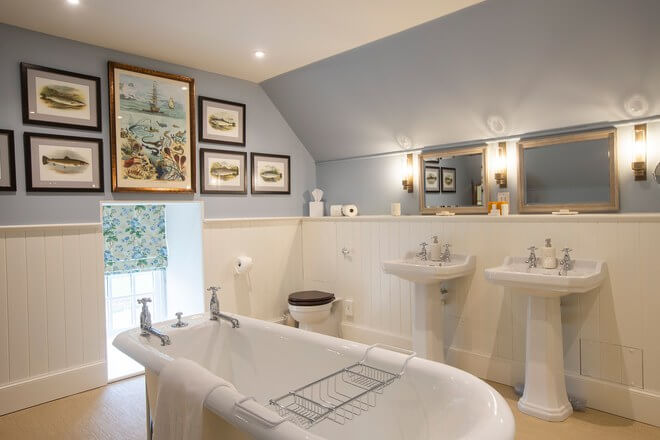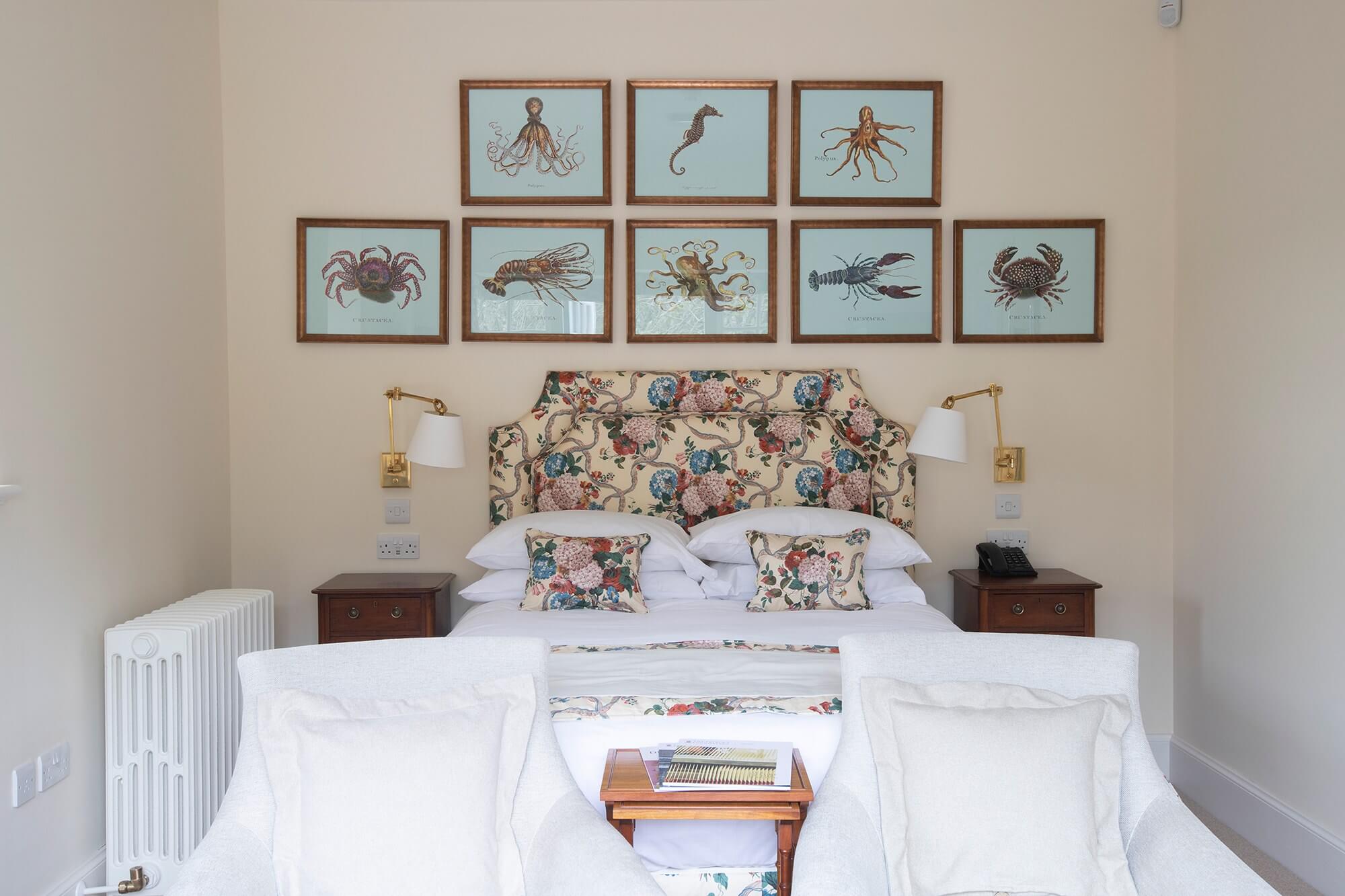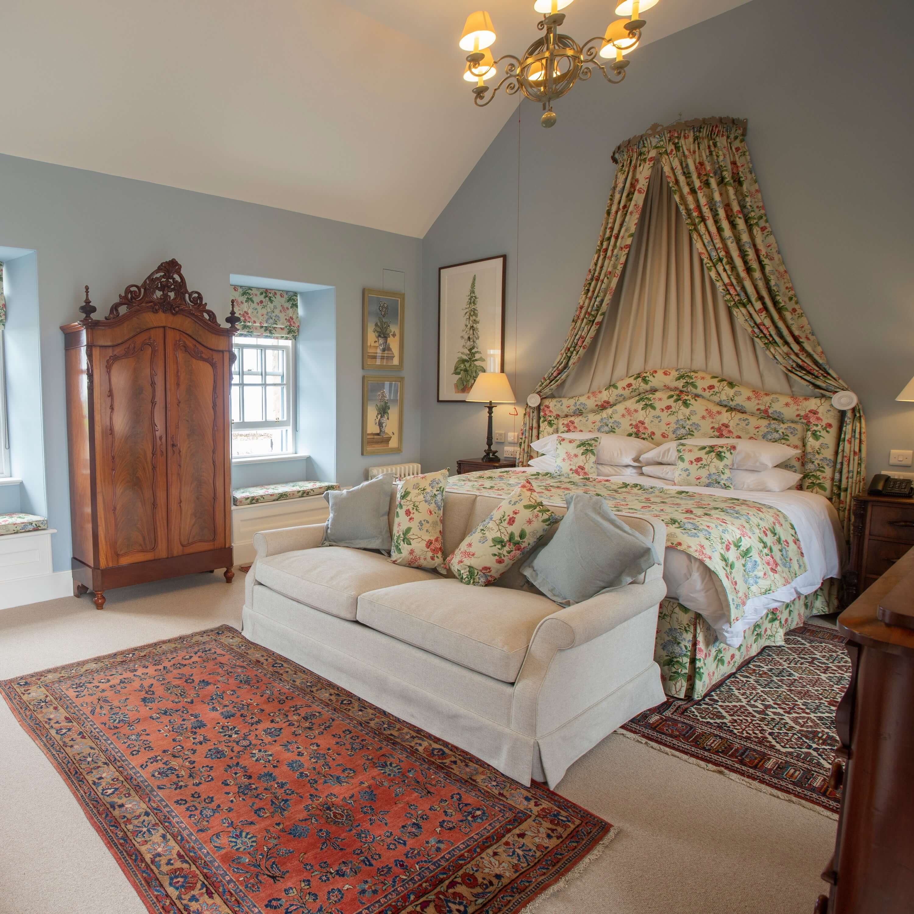 В замке всего 10 спален, 2 из которых — люксы. Все спальни отличаются стилем оформления и элементами декора. Так, одна из комнат выполнена в пастельных тонах с кроватью с балдахином, оформленным цветочным рисунком.