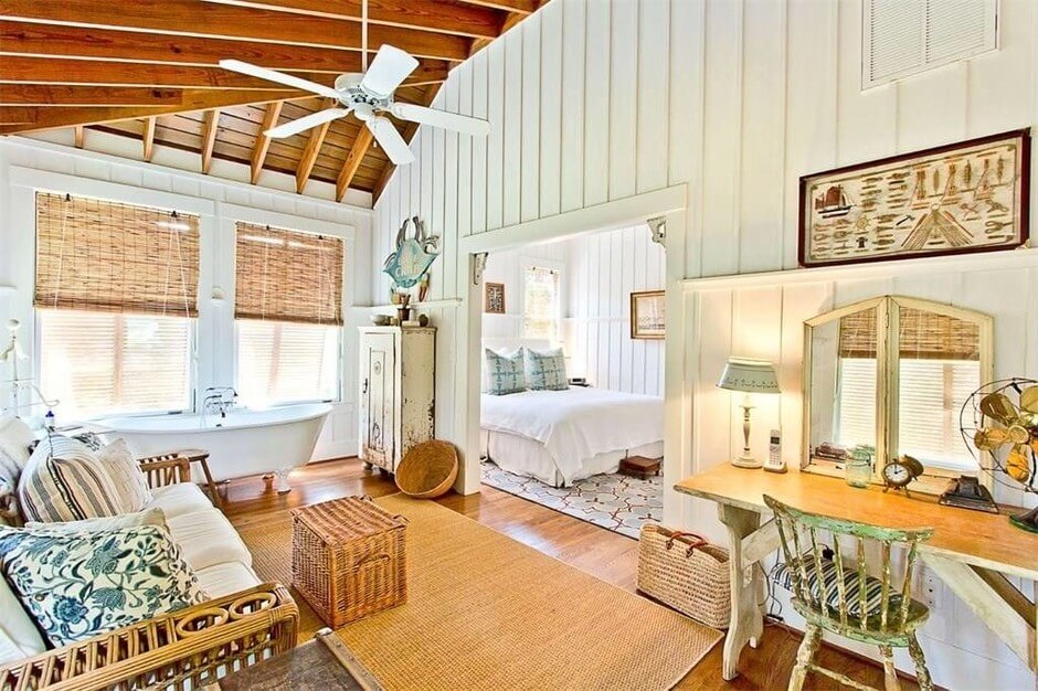 На первом этаже главного дома — просторная гостиная с большим камином и деревянными балками в потолке. Она совмещена с кухней и столовой. Хозяйская спальня состоит из двух частей: пространства для сна и лаундж-зоны с ванной, стоящей прямо посреди комнаты.