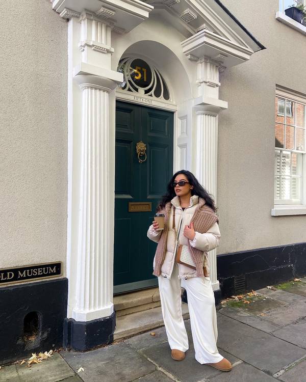 Короткі UGG з трендовою платформою інфлюенсери стилізують з вільними джинсами, светром і маскулінним жакетом. Не забудьте про зимові аксесуари – в’язані рукавички чи балаклаву. Яскраві пальто вирізнятимуть монохромні образи серед інших, додаючи ультракоротким чоботам нового рівня гламуру.