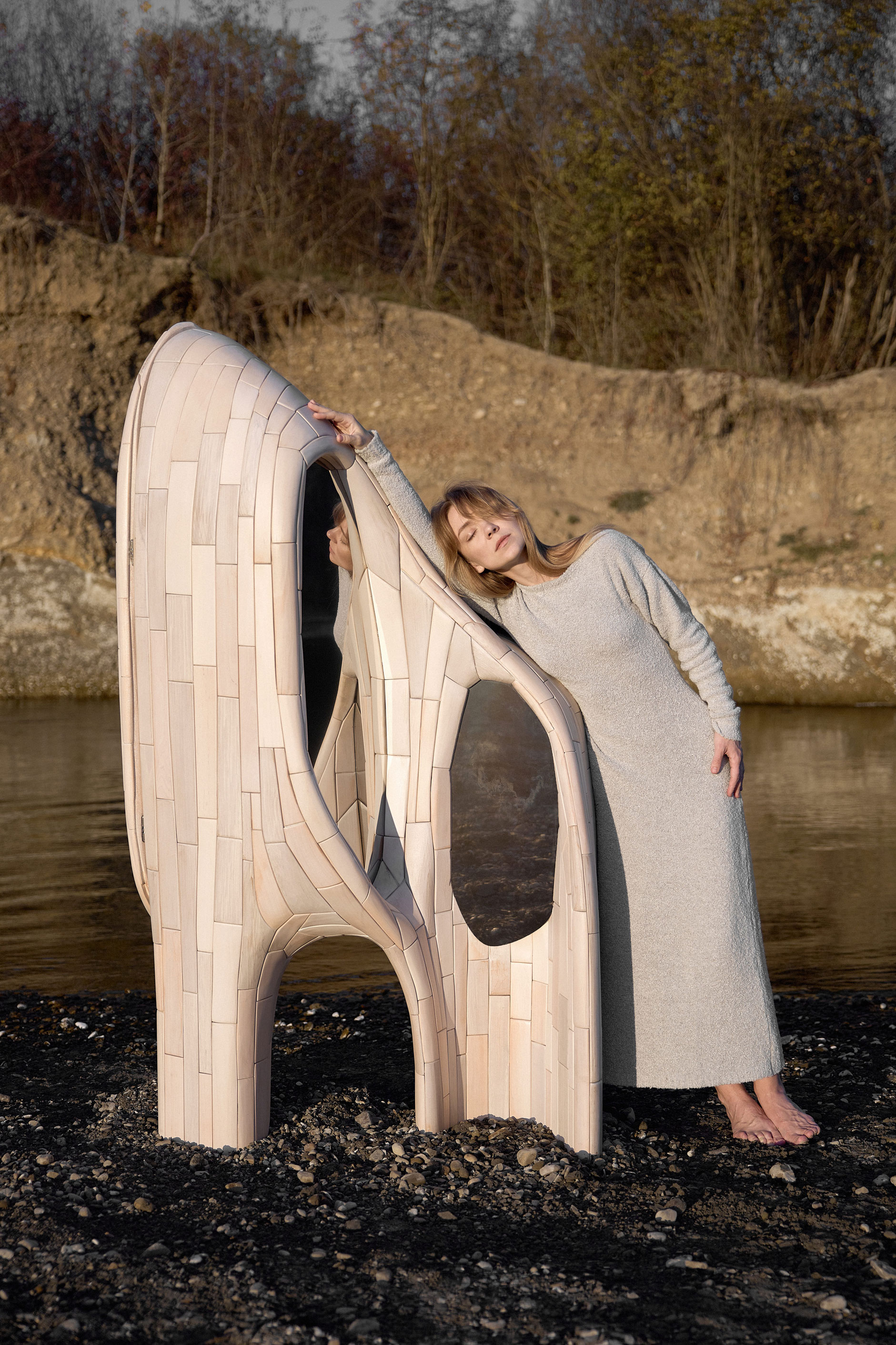 Дизайнер Андрій Михайляк інтегрує природу у свої роботи, використовуючи, зокрема метал і дерево. У межах Salon Art + Design він презентує мінімалістичний торшер «X» із сатинованої сталі. Його гладка поверхня оживає під променями теплого світла, створюючи атмосферу відстороненого спокою й легкості.