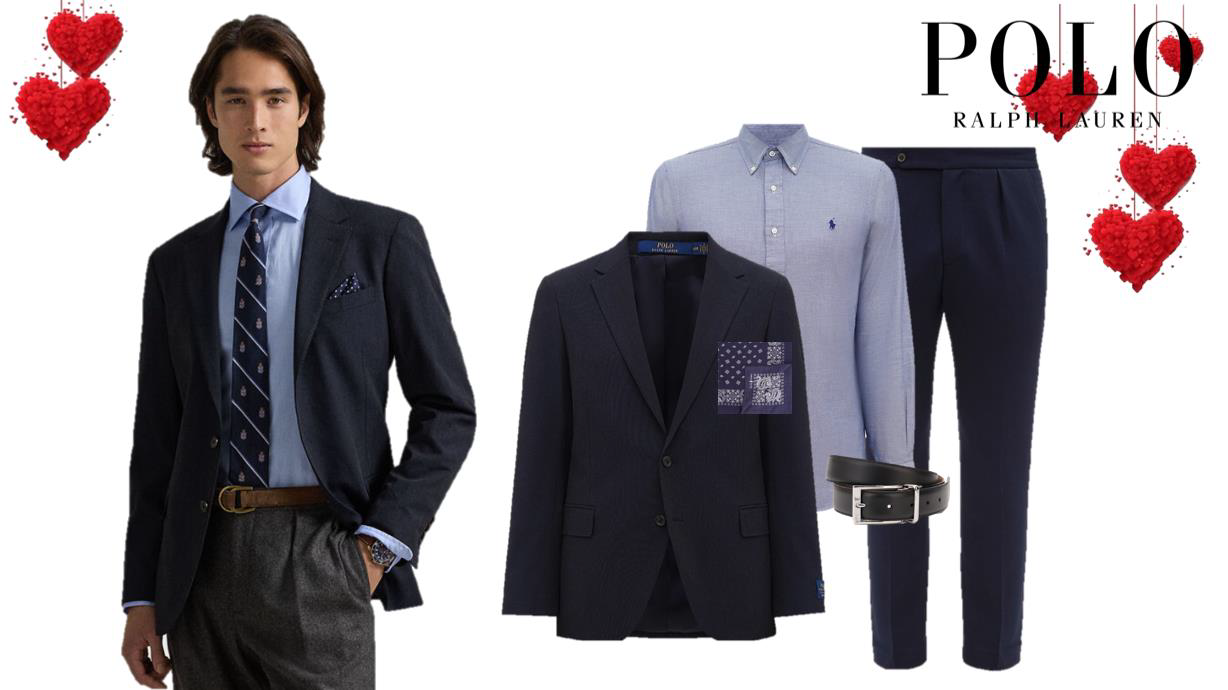 Якщо ваш партнер віддає перевагу класичному стилю в одязі, радимо зупинитись на образах від бренду Polo Ralph Laurent, відомим своїми вишуканими кроями та бездоганною якістю. До костюму в глибокому синьому кольорі пасуватиме блакитна сорочка, а балансу образу додасть ремінь правильної ширини, краватка чи хустка.