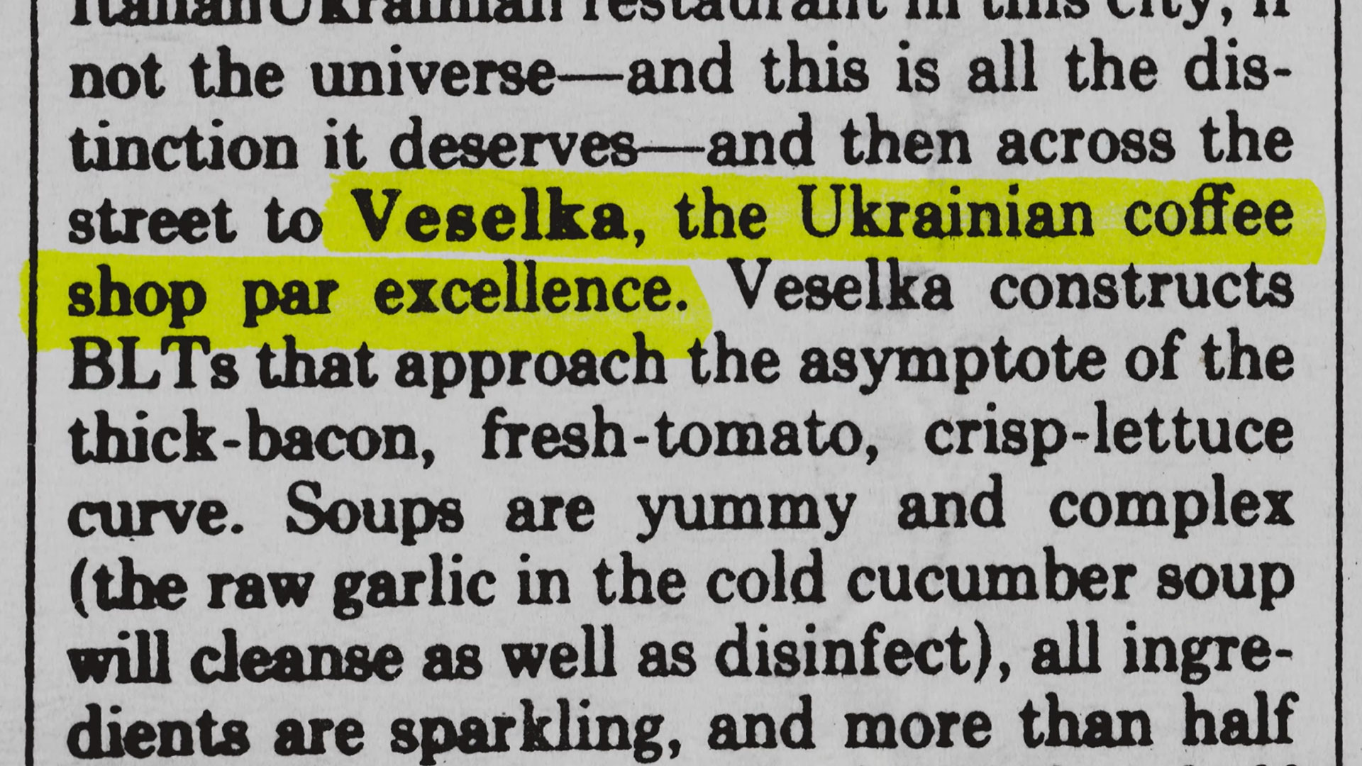 Бути українцем означає розповідати про свою культуру, у тому числі й гастрономічну, іншим. У 1954 році в східному районі Мангеттену, Нью-Йорк, відкрився заклад української кухні Veselka. Його заснувала пара біженців Володимир та Ольга Дармохвали, що мігрували до США після Другої світової війни. Спочатку «Веселка» виглядала як газетний кіоск, проте вже в 1968 році двері ресторану відчинилися на Дев’ятій вулиці міста. У 1980-му до закладу вперше завітають національні медіа: тоді The Village Voice запропонує читачам дебютний огляд на Veselka.