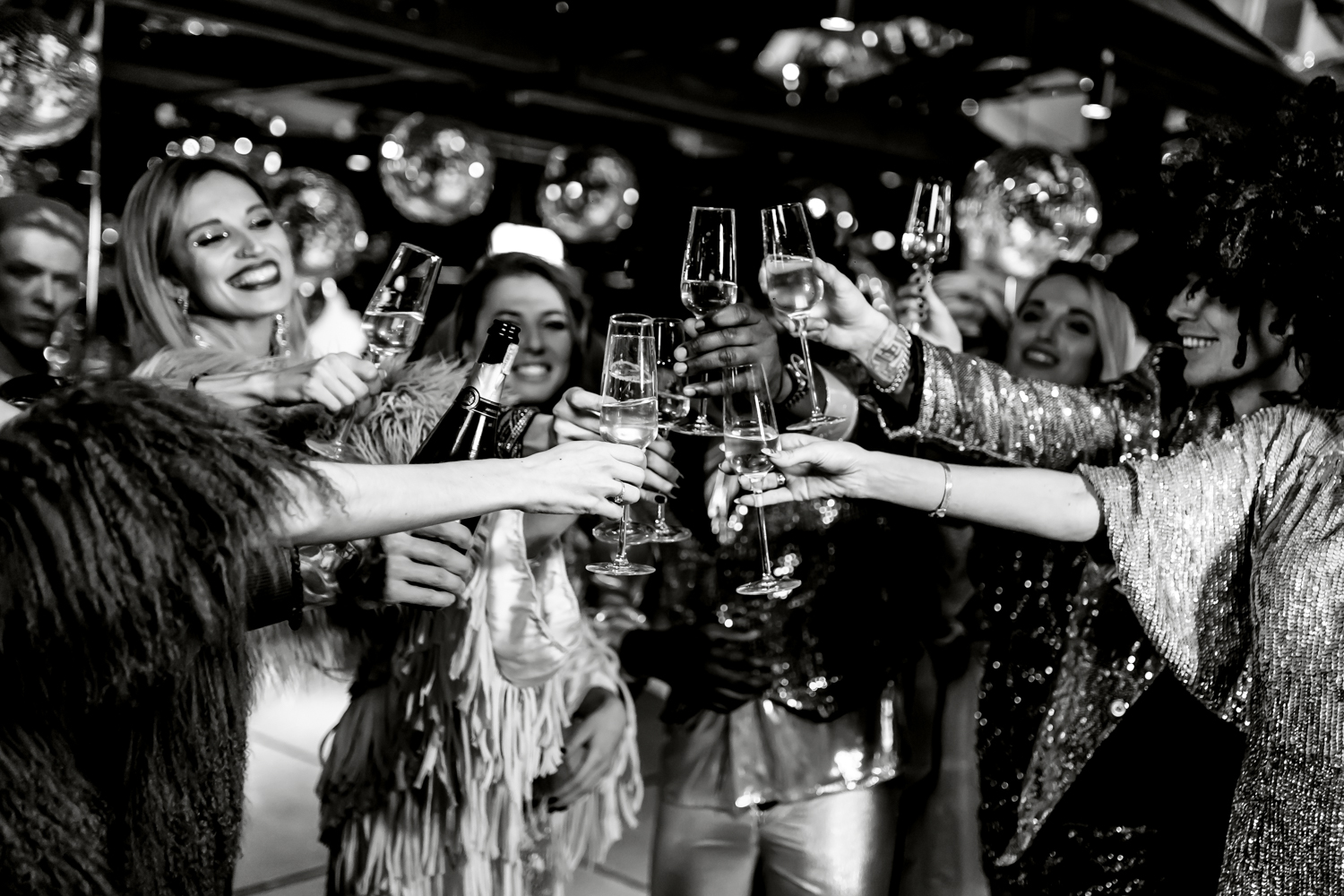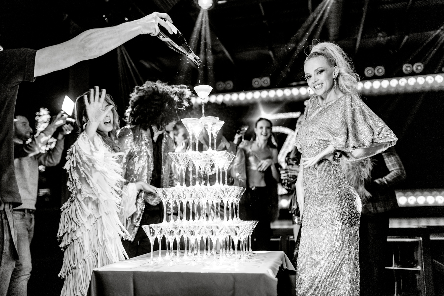 Музыка диско, шампанское, тематический дресс-код, море глиттера и метафана.