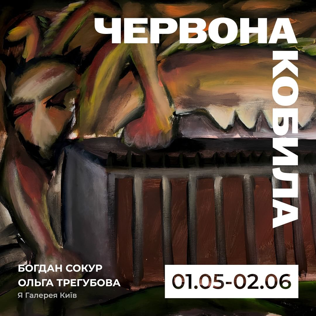 На новій виставці «Я Галереї» представлять роботи художників Богдана Сокури та Ольги Трегубової. Назва експозиції — «Червона кобила» — відсилає до уявлення про чотирьох вершників апокаліпсиса. Про червону кобилу, на якій їде один із них і несе війну, Ольга Трегубова дізналася ще в дитинстві. У своїх творах мисткиня передає відчуття очікування й тривоги, досліджує християнський образ кінця світу та вплітає його у своє життя. Заразом Богдан Сокур познайомився з червоною кобилою під час тренувань на військових полігонах. Його роботи — це зображення наслідків війни, яка триває вже не перше століття.