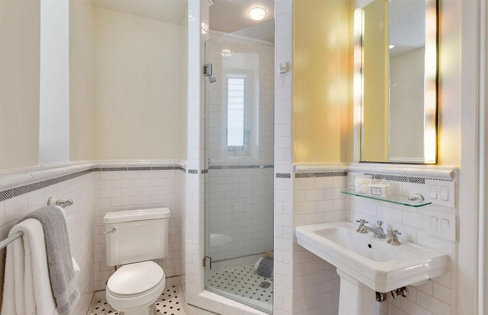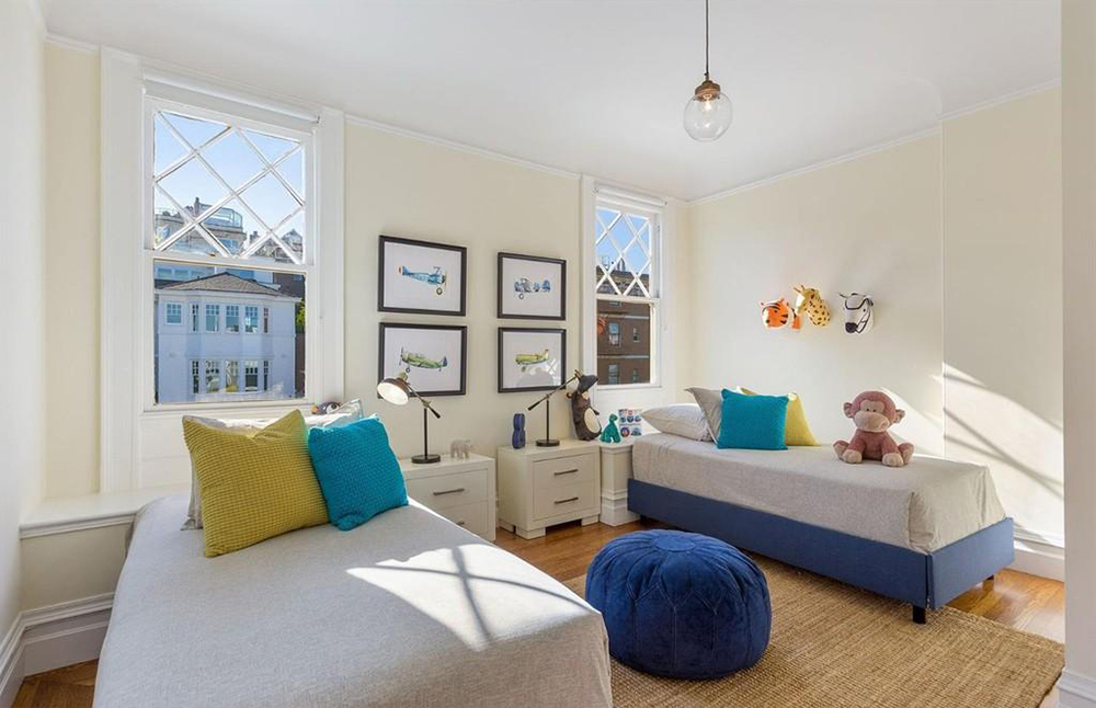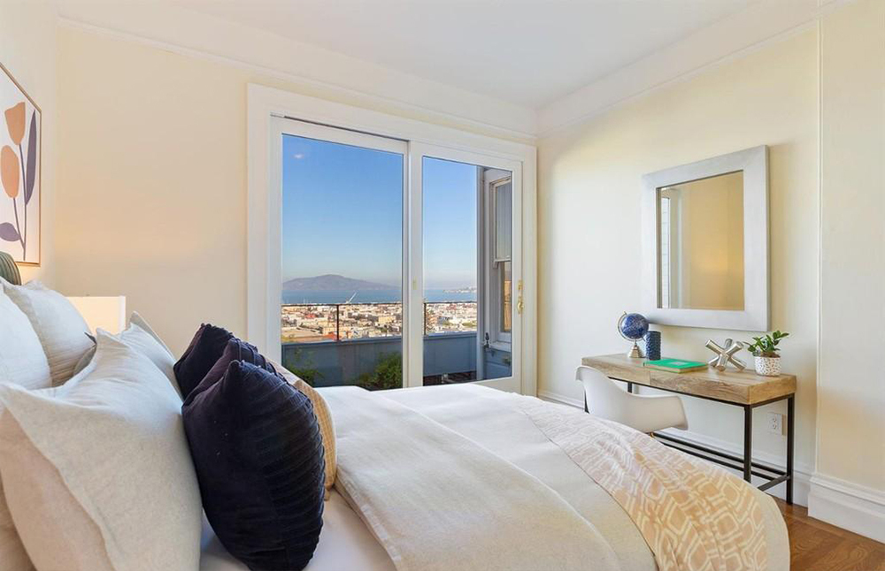 Все 3 спальни расположены на верхнем уровне резиденции площадью 3140 квадратных футов. Между двумя комнатами есть дровяной камин с мраморным фасадом, гардеробная и ванная комната с огромной ванной на ножках и белой плиткой. Стеклянные двери-окна выходят на узкий балкон с видом на залив.