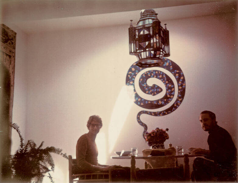 Из первого путешествия Ив и Пьер вернулись не с пустыми руками: они приобрели виллу, название которой в переводе с арабского означает “дом змей”. Ив нарисовал большую змею на стене в обеденной комнате, а письма и приглашения оттуда были помечены тем же символом. Дом был небольшим, и дизайнер обставил его мебелью, найденной на местных рынках. На территории поместья рос лимонный сад, через который шла аллея прямо к моске.