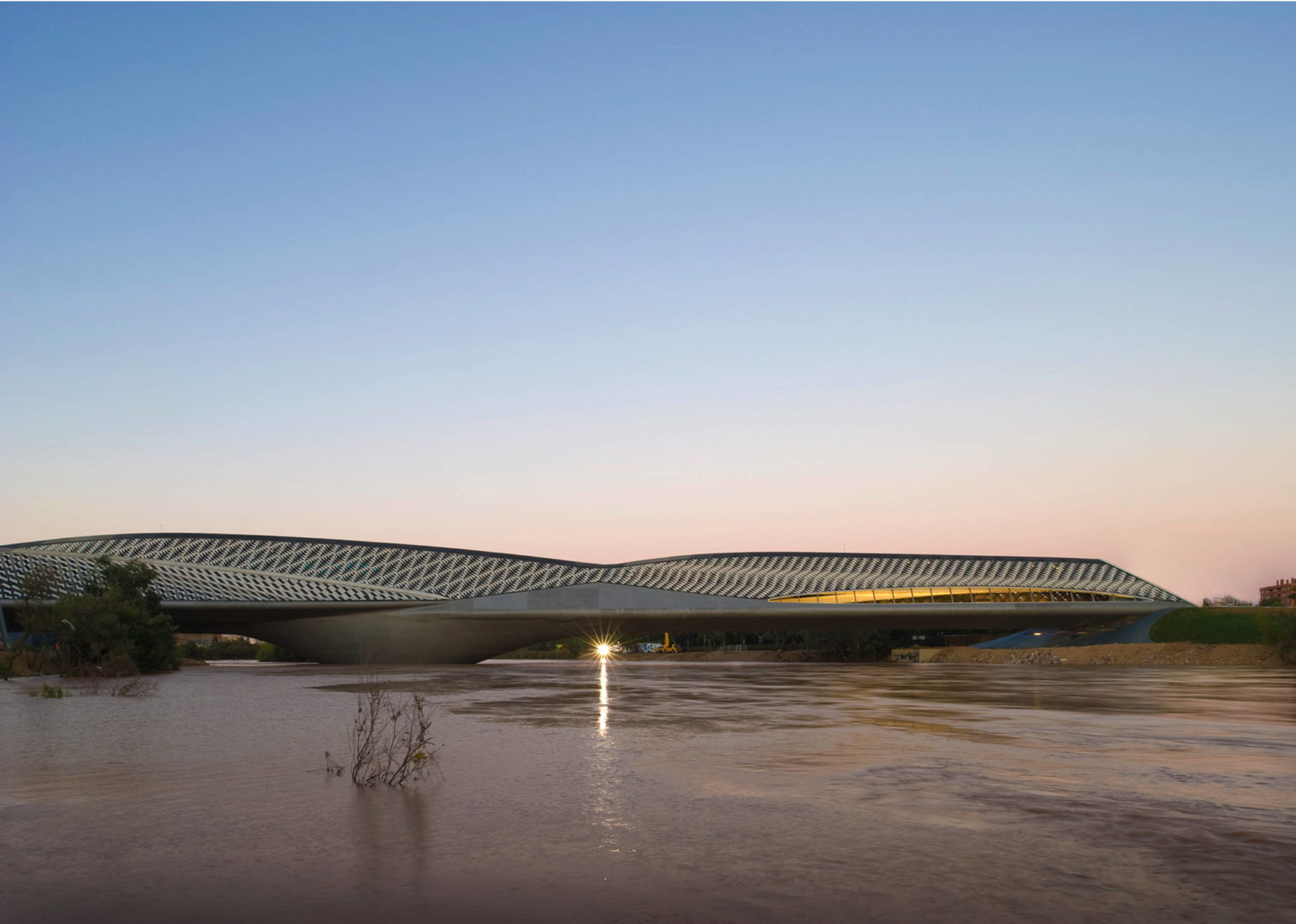 Майже 300-метровий об’єкт у Сарагосі, Іспанія, є одночасно мостом і павільйоном для виставок. Своєю формою він нагадує гладіолус із різними за розміром кінцями, а його пористе покриття натхненне шкірою акули. Споруда складається з «водоймищ», чотирьох структурних елементів.