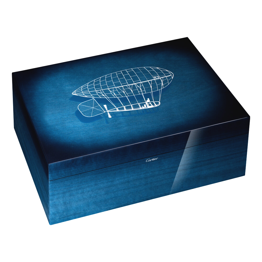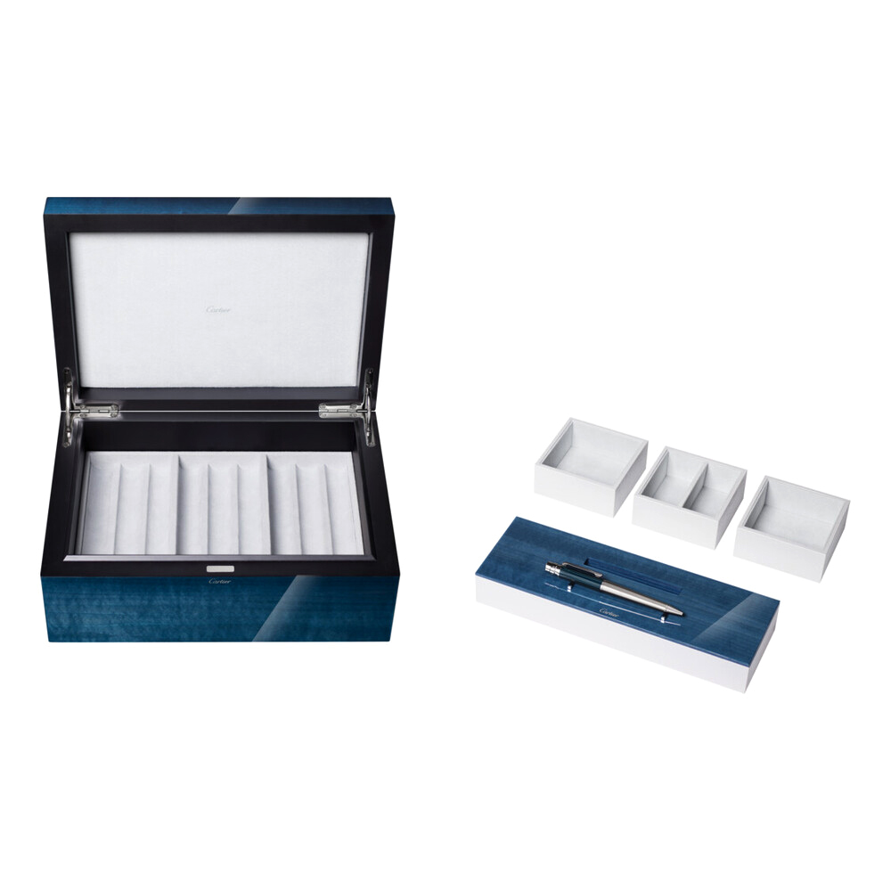 Набір для робочого кабінету Santos de Cartier виготовлений із дерева з синім лаковим покриттям: знімна підставка для ручок та візитних карток, чотири знімні ящики, таця для ручок із секретним подвійним дном, внутрішня сторона обтягнута тканиною. Розміри: 23,8 x 33 х 12,8 см.
