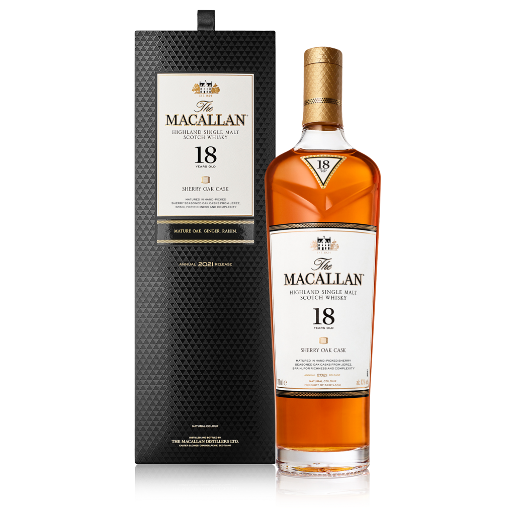 Віскі The Macallan Sherry Oak 18 Years Old входить до лінійки односолодових віскі з насиченим та складним смаком. Для витримки використовуються лише дубові бочки з-під хересу Oloroso, поштучно відібрані на виноробнях на околицях іспанського міста Херес. Багатий смак із нотами дуба, імбиру та родзинок доповнюється гарним натуральним кольором світлого червоного дерева.