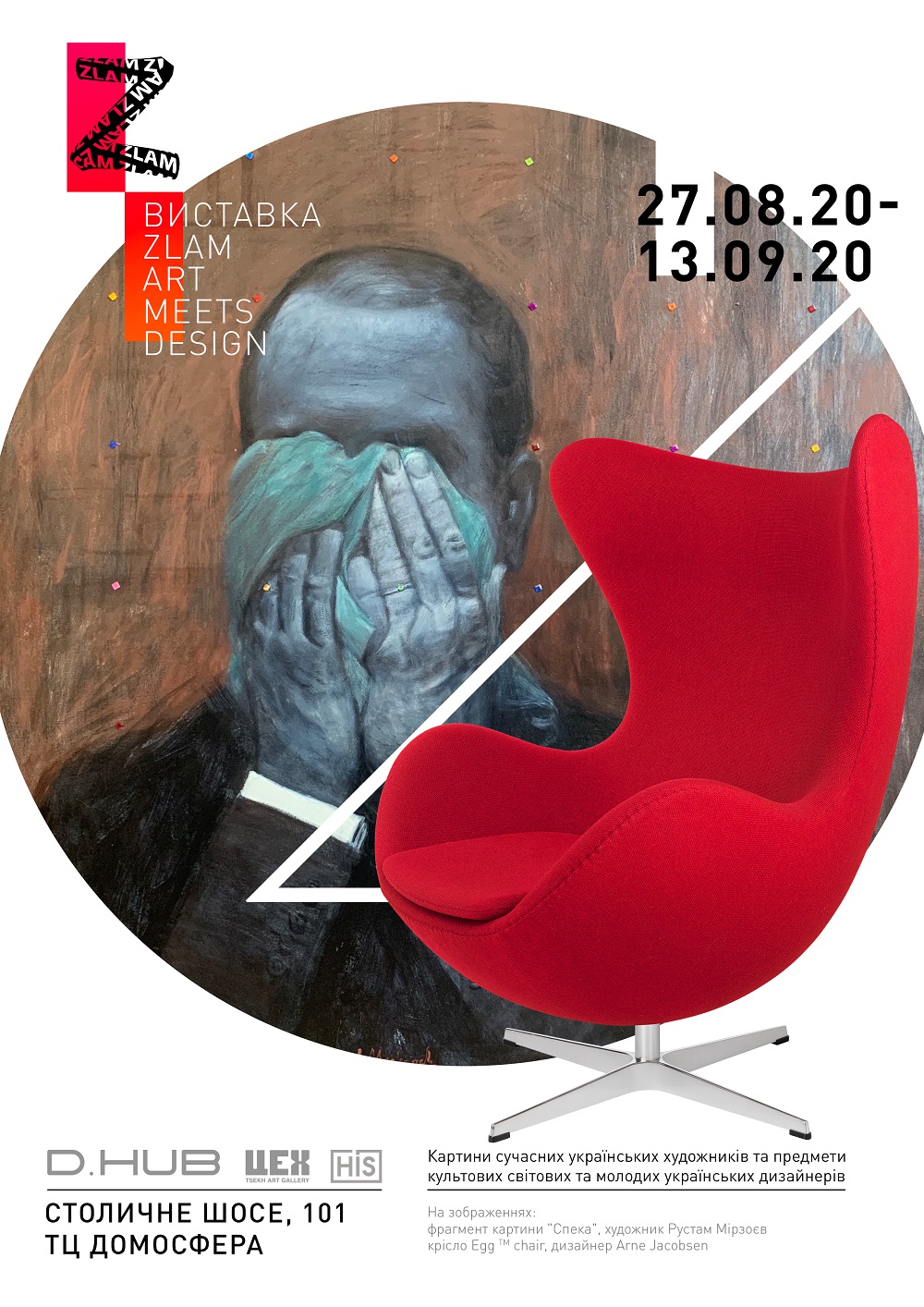 С 27 августа по 13 сентября 2020 г. в выставочном пространстве D.HUB пройдет арт-событие ZLAM. Идея выставки – отразить влияние переломных моментов на творчество художников и предметных дизайнеров. Главным дизайнером выставки ZLAM стал известный украинский дизайнер интерьеров Юрий Зименко. С помощью игры света, использования цвета, звуковых и визуальных эффектов Юрий определяет импульс ZLAMа, а изобразительное искусство показывает в коллаборации с предметами дизайна.
