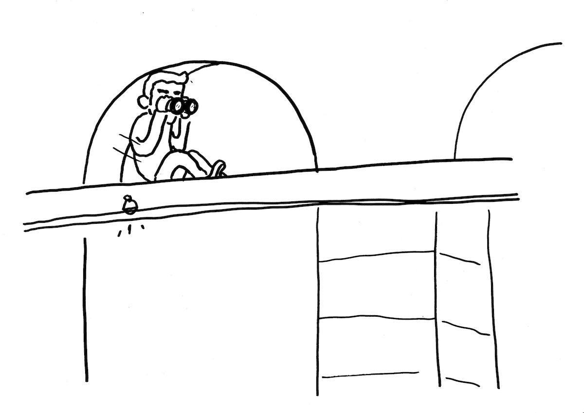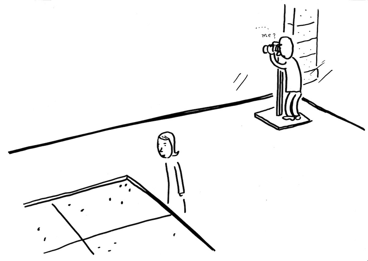 Вторая инсталляция носит название “I am looking at me being watched by someone else"  и позволяет ощутить то первое впечатление от видения себя глазами незнакомца. Посетитель, смотрящий сквозь бинокль, испытывает  чувство удивления, осознав, что он видит самого себя через восприятие своего образа другим смотрящим. Таким образом перед нами открывается реальное осознание того, сколько глаз шпионит за нами не только в повседневной жизни, но и в общественных местах. Это напоминает нам предположение Вито Аккончи -  великого архитектора, дизайнера и авангардиста: «Когда-то площадь была местом встречи и обмена идеями, теперь это возможность для наблюдения».