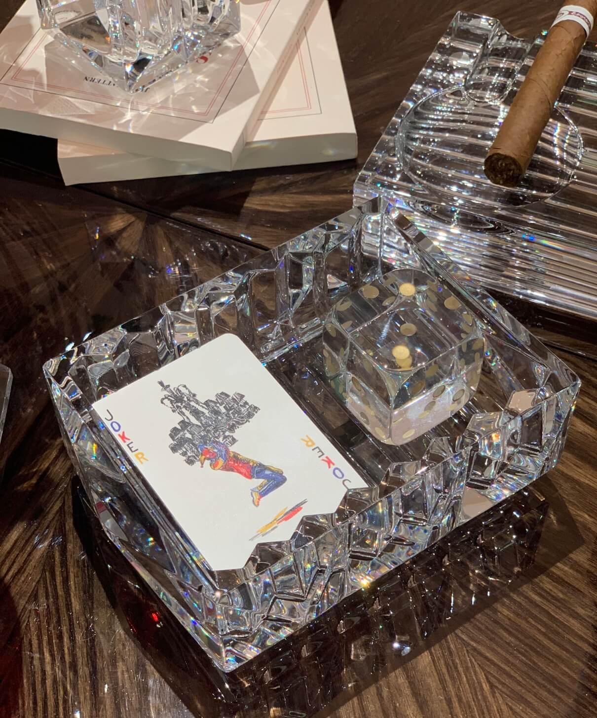 Как всегда порадовала всемирно известная мануфактура BACCARAT. В новом сезоне ассортимент фабрики пополнился эксклюзивными хрустальными изделиями для заядлых геймеров: шашки, шахматы, кости, нарды. А для любителей покера выпустили карты в элегантном хрустальном боксе.