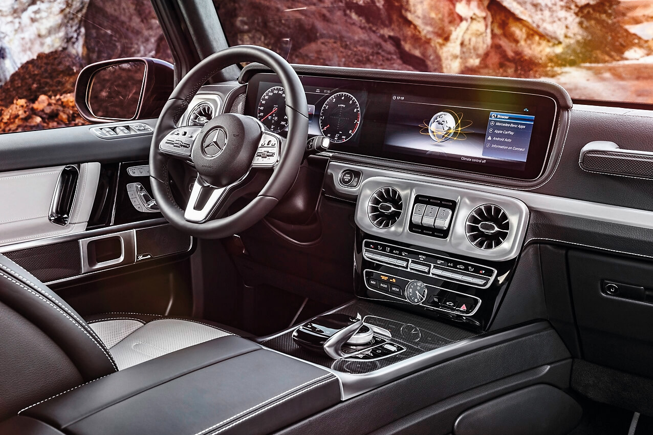Если снаружи классический внедорожник подвергся лишь деликатной доработке, то внутри можно обнаружить радикально преобразившийся интерьер. В отделке салона используются высококачественные материалы, а каждая деталь соответствует своему функциональному назначению. В интерьере можно найти отсылки к внешнему облику автомобиля. Например, круглые дефлекторы обдува перекликаются с формой фары, а динамики по краям торпеды напоминают оригинальные указатели поворота. Характерными деталями для G-Class являются поручнидля переднего пассажира, а также хромированные переключатели блокировки трех дифференциалов.