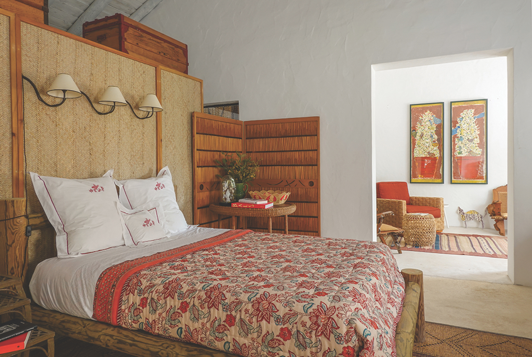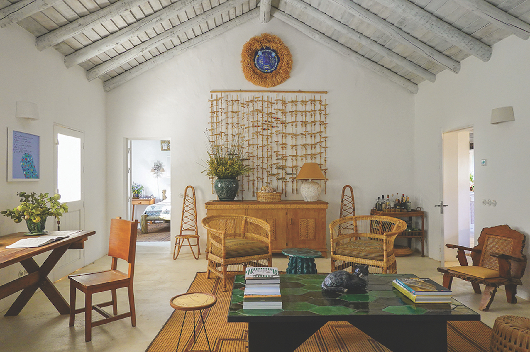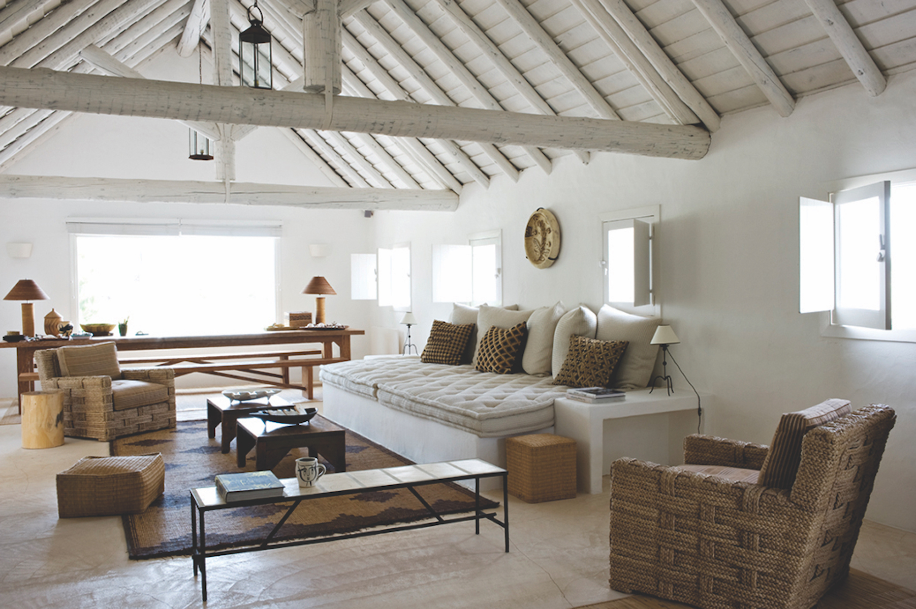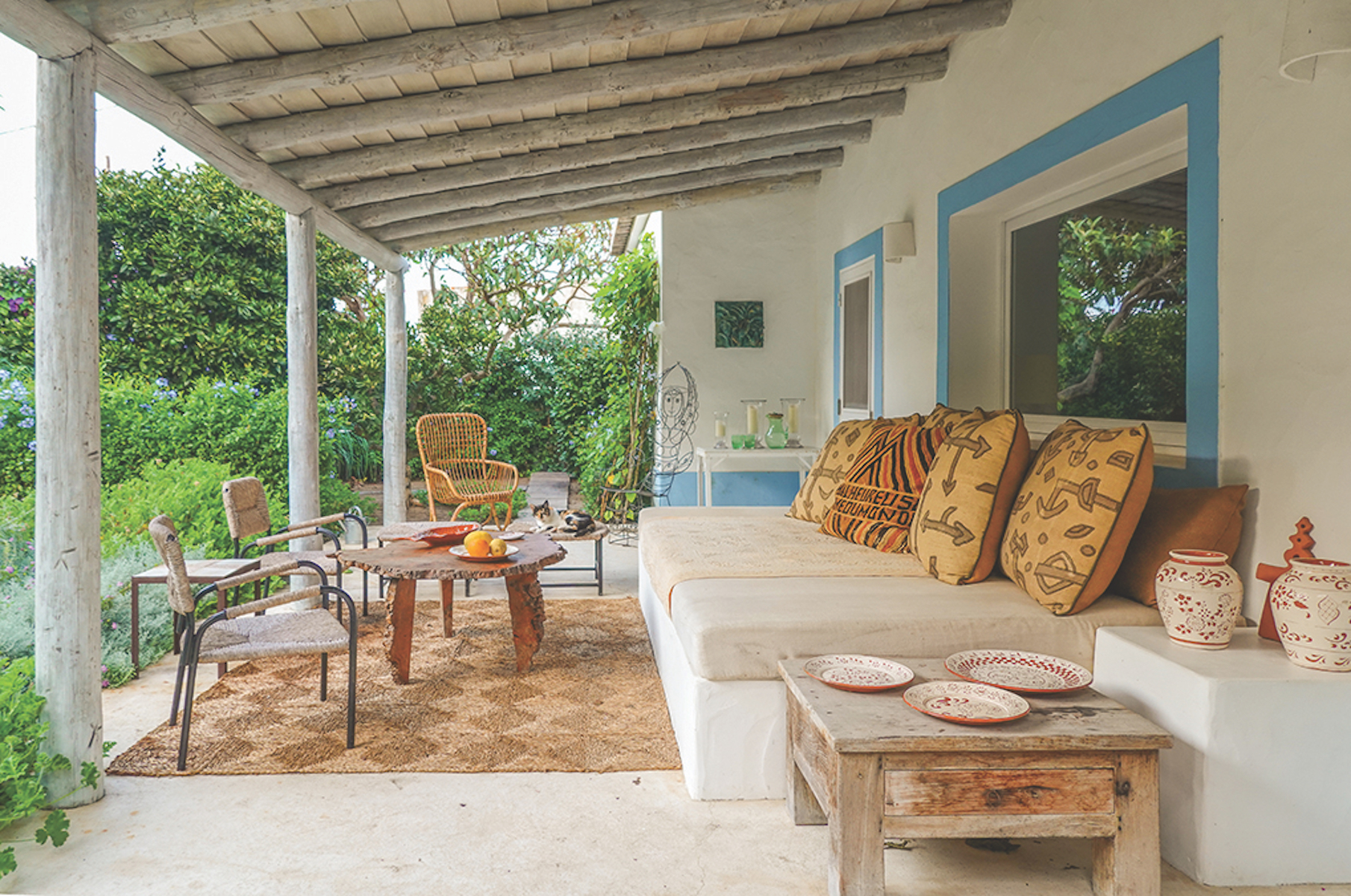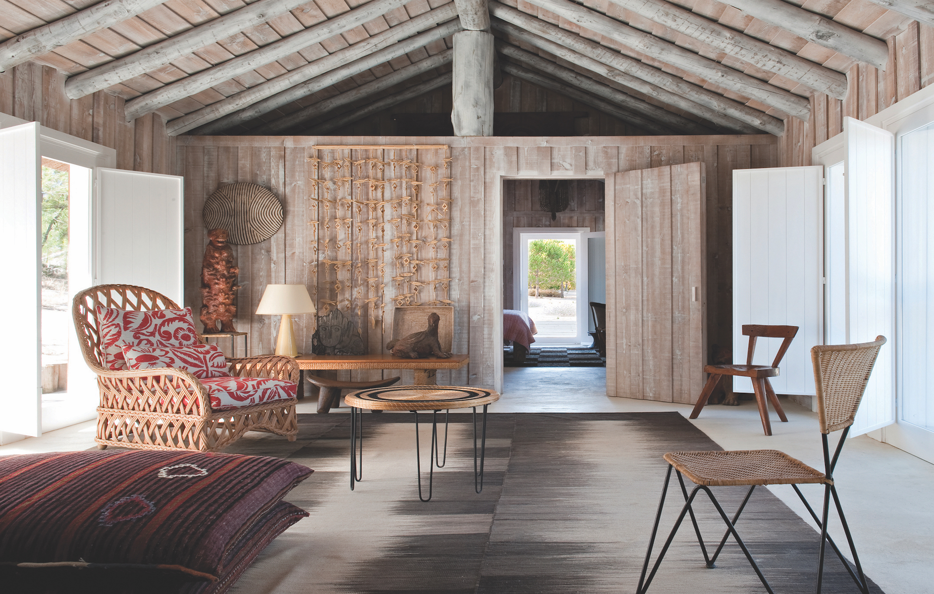 После того судьбоносного полета Гранж стал расспрашивать об этом месте свою подругу Веру Якию, португальского дизайнера и декоратора, в свое время работавшую у него в Париже. У Веры был домик в Компорте. Она пригласила Жака погостить в этой крытой тростником пляжной хижине, в которой не было в то время ни электричества, ни водопровода. Большинство местных жителей перемещались по пляжу на багги для езды по песку, а по водным каналам – на цветастых деревянных лодках. Гранж был в полном восхищении от подобного идиллического образа жизни и в конце концов купил у Якии бывшее бунгало ее матери в городке Карвалью. При том что дизайнер славится своими роскошными интерьерами (он оформлял дома Ив Сен-Лорана, Софии Копполы, интерьеры The Mark Hotel в Нью-Йорке), для собственного тихого прибежища он выбрал спокойный и доволь- но скромный стиль. Гранж сохранил простой внешний вид дома, напоминающего рыбацкую лачугу, а изнутри полностью все побелил. Комнаты украсил марокканскими коврами, мебелью из ротанга и красочной португальской керамикой. «Я люблю море. Обожаю морской климат. Люблю здешнее чувство свободы», – говорит декоратор.