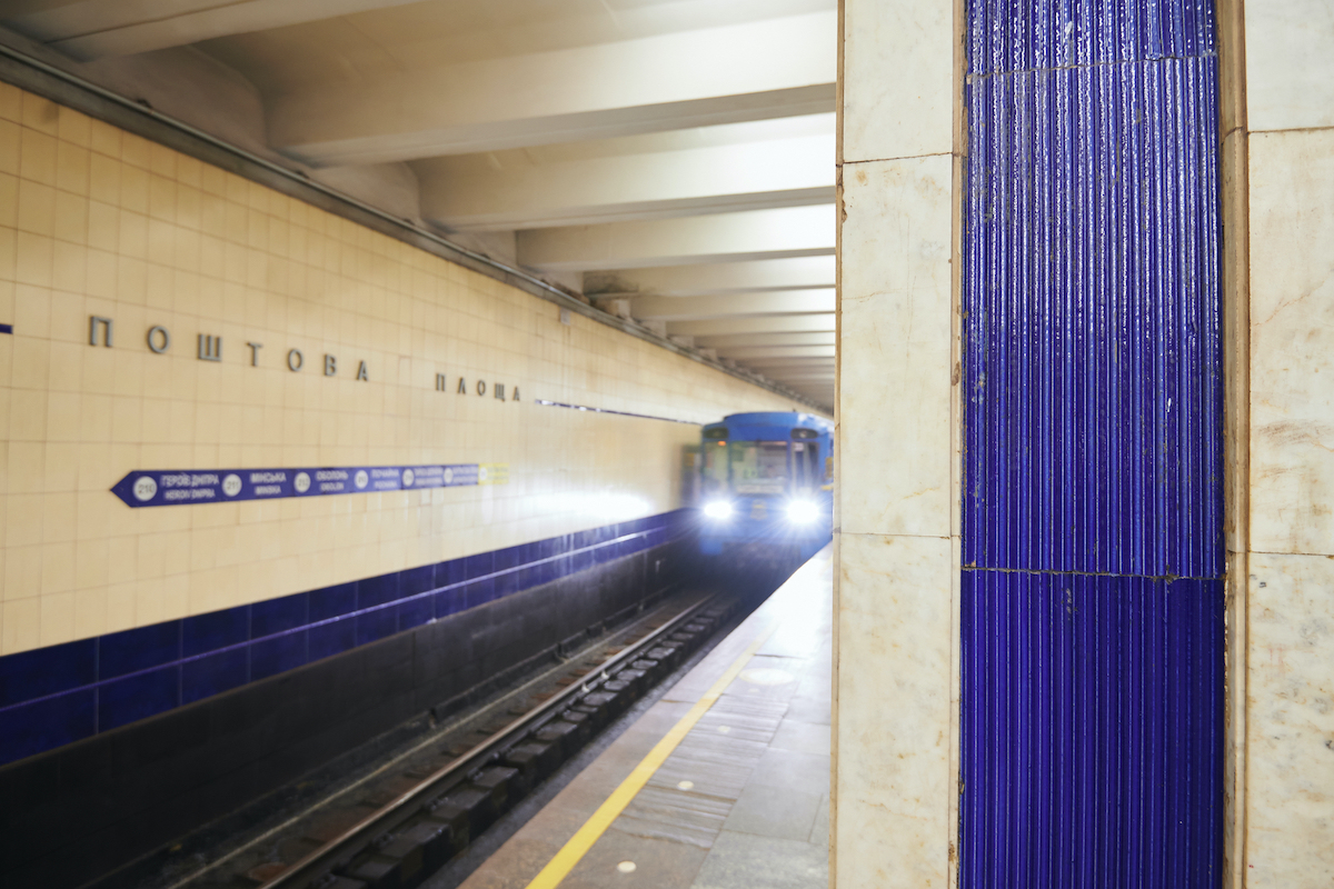 К счастью, следующая наша остановка – «Почтовая площадь» (проектное название – «Речной вокзал») – с точки зрения дизайна замечательно удалась и сохранилась. В разговорной речи за станцией закрепилось прозвище «ванная» из-за непривычно большого количества плитки в отделке: здесь она покрывает путевые стены вместо привычного мрамора. Впрочем, прозвище «детская» в случае «Почтовой площади» также имеет право на жизнь, поскольку это единственная «уменьшенная» станция киевского метро: вместо типовых 10 м ширина ее платформы составляет лишь 8 м. Изменили проект ради спасения архитектурного ансамбля узкой (20 м) улицы Сагайдачного: строительство по «стандартному» плану требовало сноса доброй половины домов вдоль подземных путей.