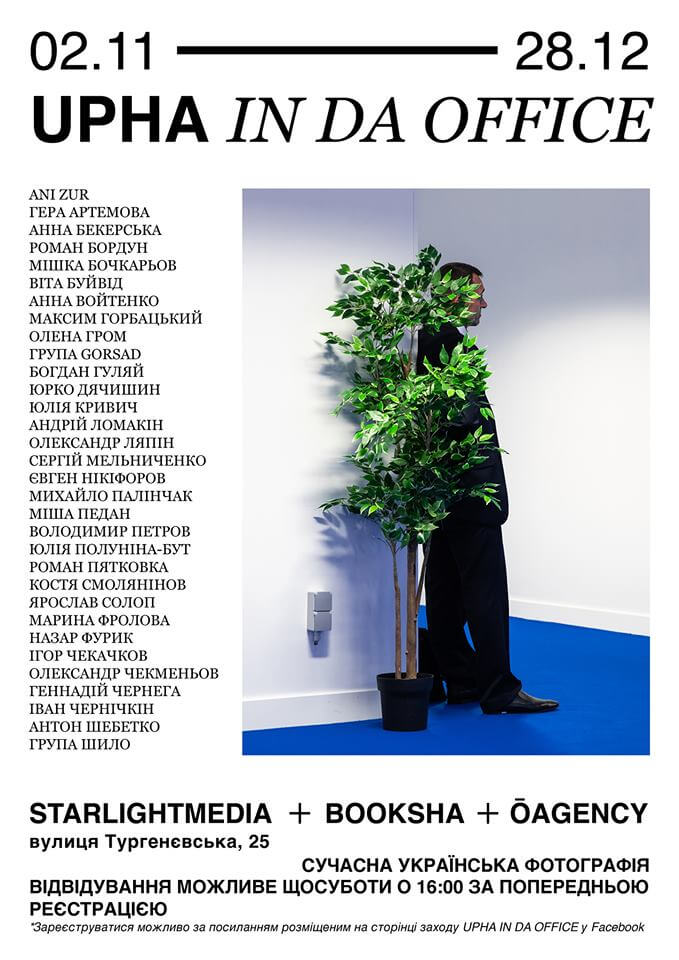 UPHA IN DA OFFICE — частичная репрезентация подходов, взглядов, процессов современной фотографии Украины. Работы участников выставки объединены пятью основными темами, которые отражают, реалии нашего общества: постсоветский синдром, внутри которого мы все еще ощущаем преемственность советской эпохи; столкновение с социальными проблемами; отношение к религиозным канонам; военные конфликты; гендерная проблематика и конструкт телесности.