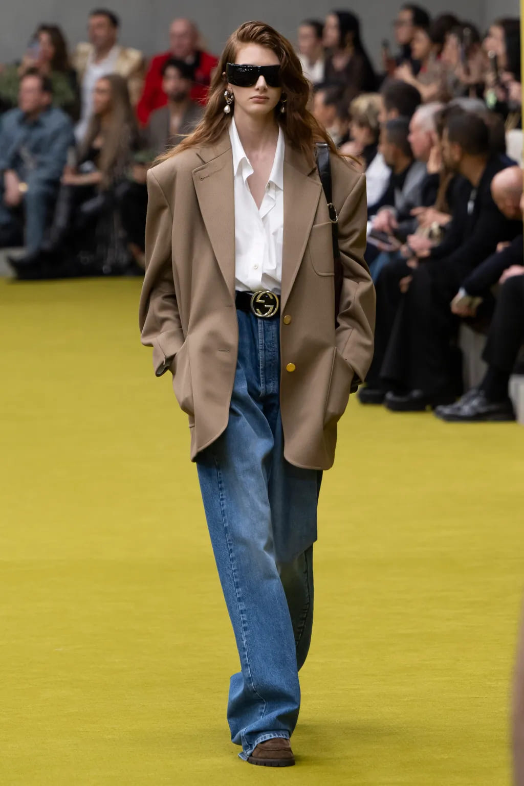 Блейзери та тренчі. Ближче до більш прохолодного періоду, у золотий розпал осені, зверніть увагу на блейзери та тренчі. Звісно, цього сезону трендовим є певна гіперболізація плечей за рахунок підкладок у жакетах або ж тренчах, водночас більш ніжний силует підкреслить ваш настрій або тендітну натуру. Наочним прикладом є моделі Gucci: одна з них застилізувала великий, наче з чоловічого плеча, жакет з синіми джинсами, а інша – тренч вільного крою з м’якими плечима. Також новим для вас рішенням може бути використання сорочки або ж теплого лонгсліву замість пояса.