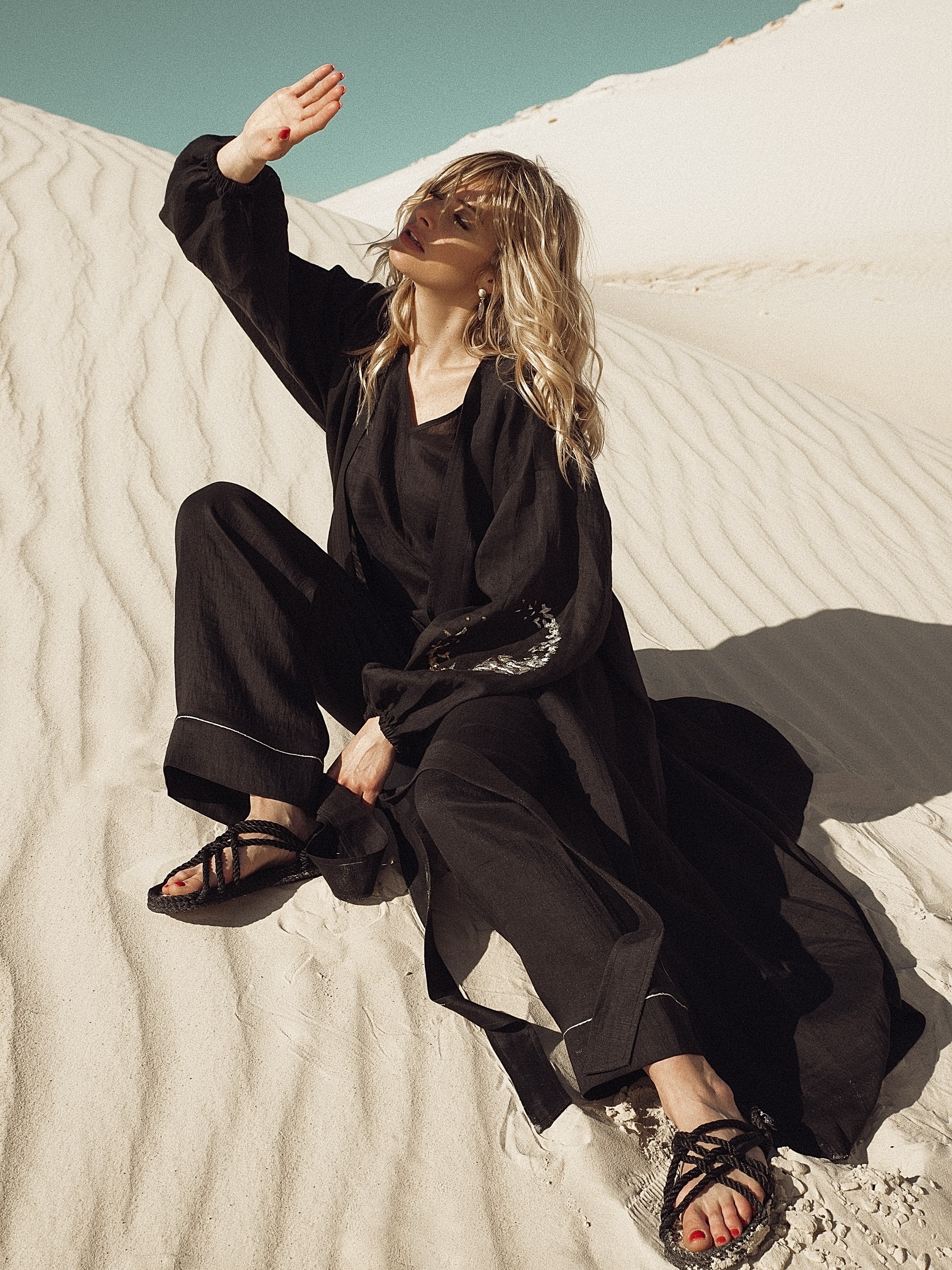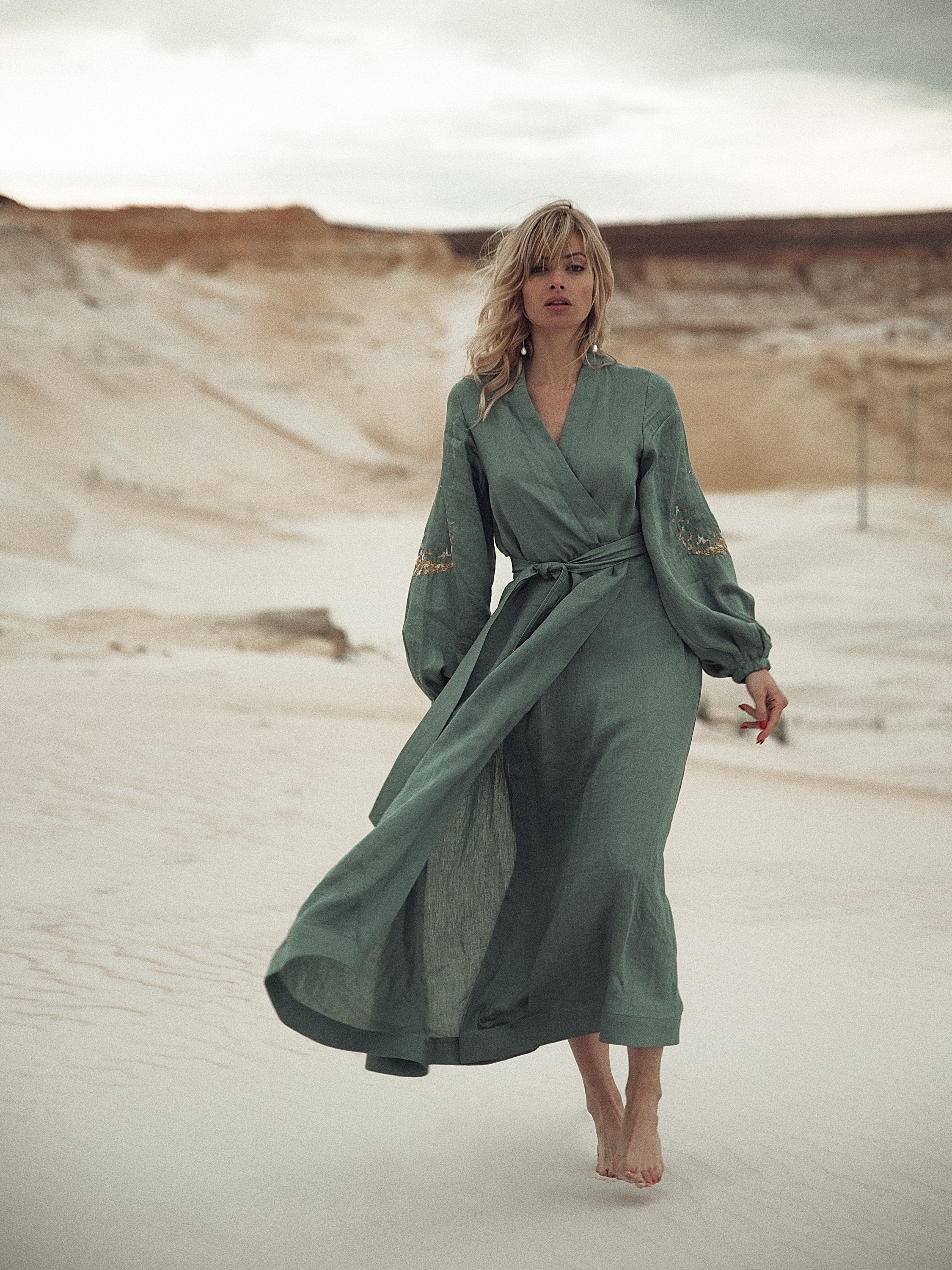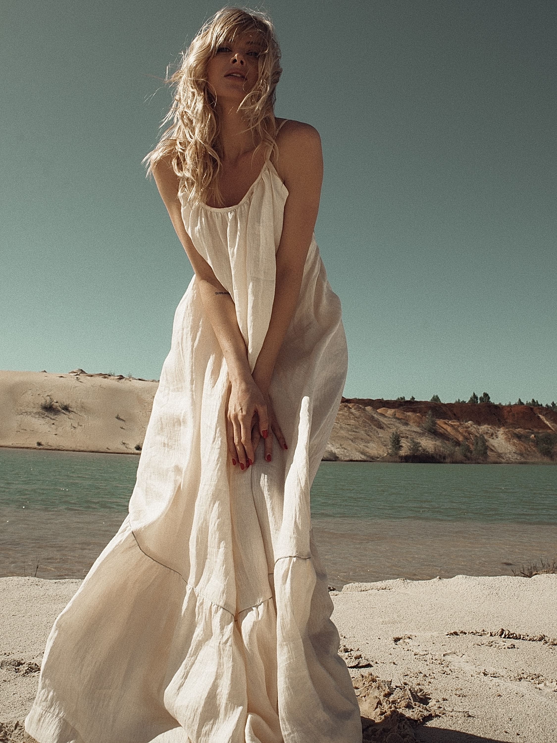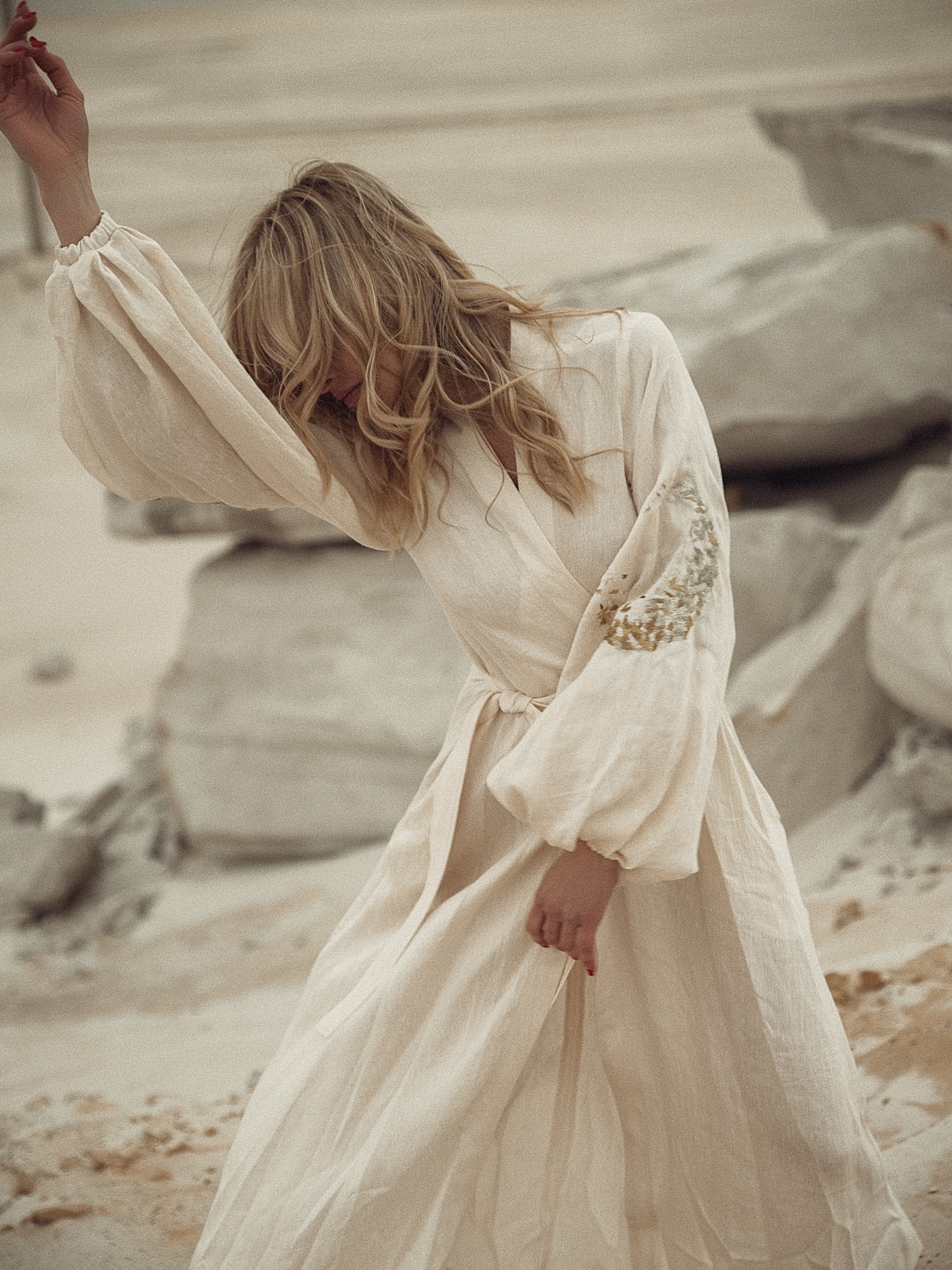 В круизную капсулу украинского бренда вошло несколько моделей в разных цветовых решениях: платья на запах, костюмы с кимоно и легкие струящиеся сарафаны. Вся коллекция выполнена из натурального дикого льна, а в качестве акцента и отличительной детали использовалась вышивка с металлизированными золотыми и серебряными нитями на рукавах. Сарафаны с открытой спиной украшает декор из горного хрусталя и речного жемчуга.