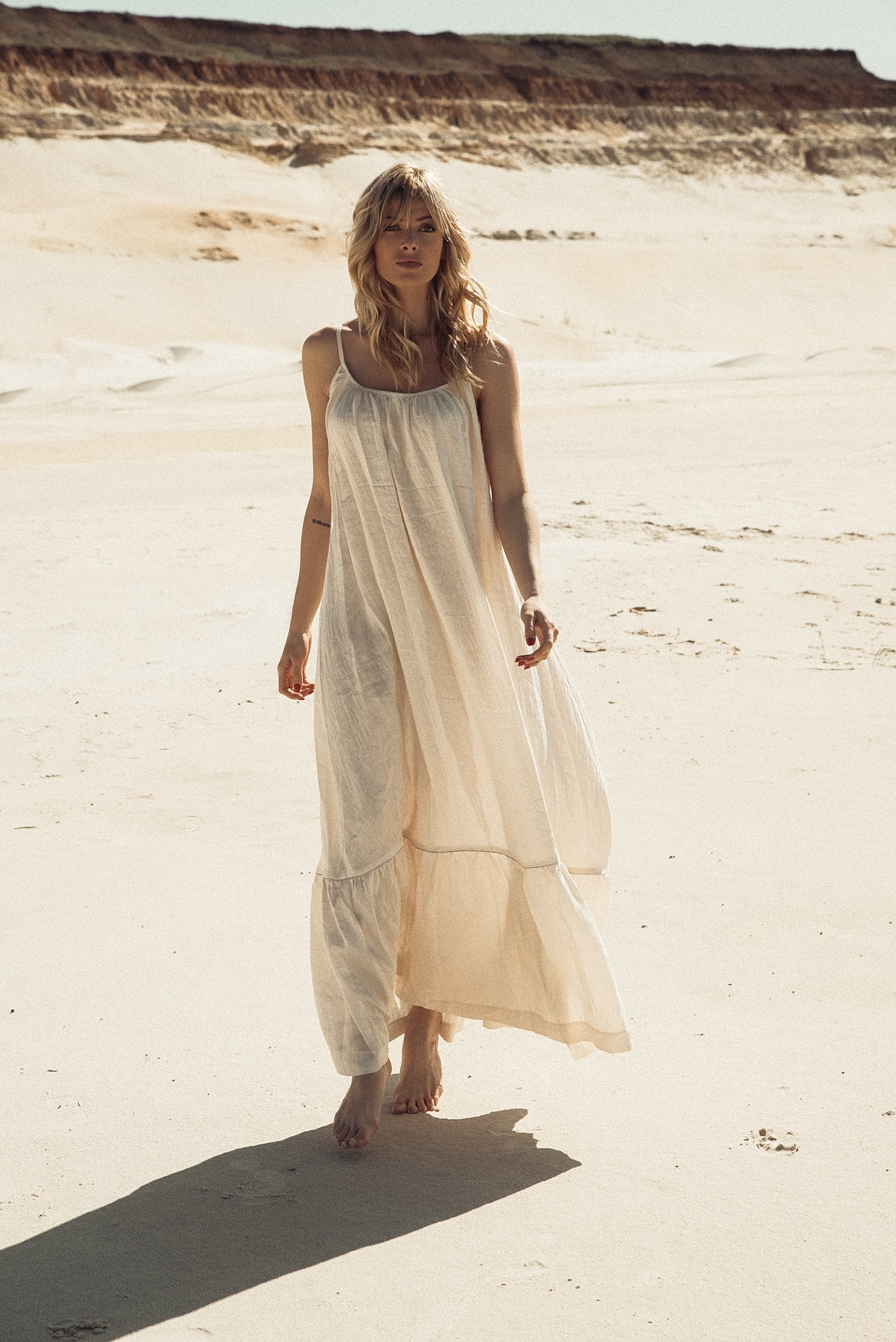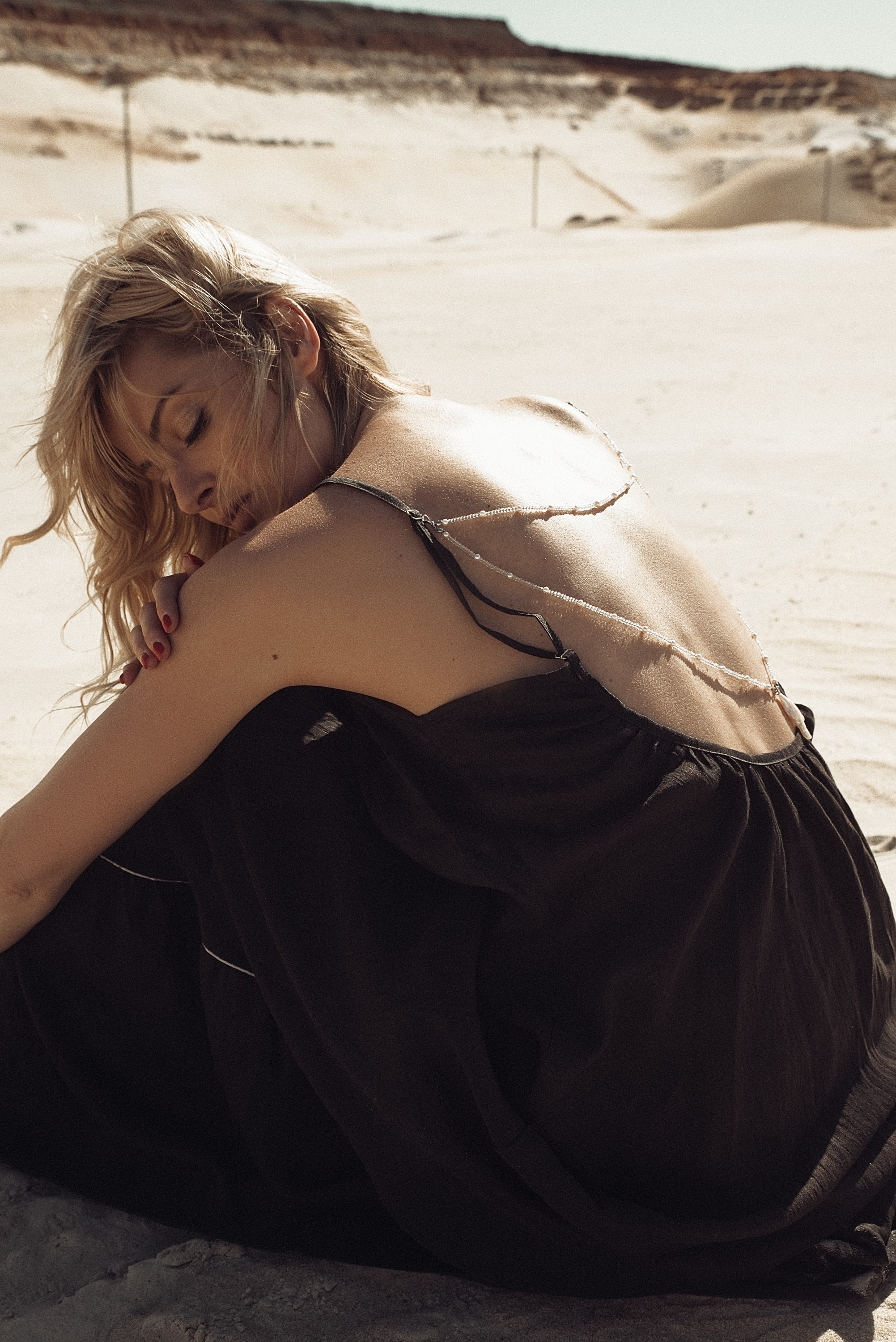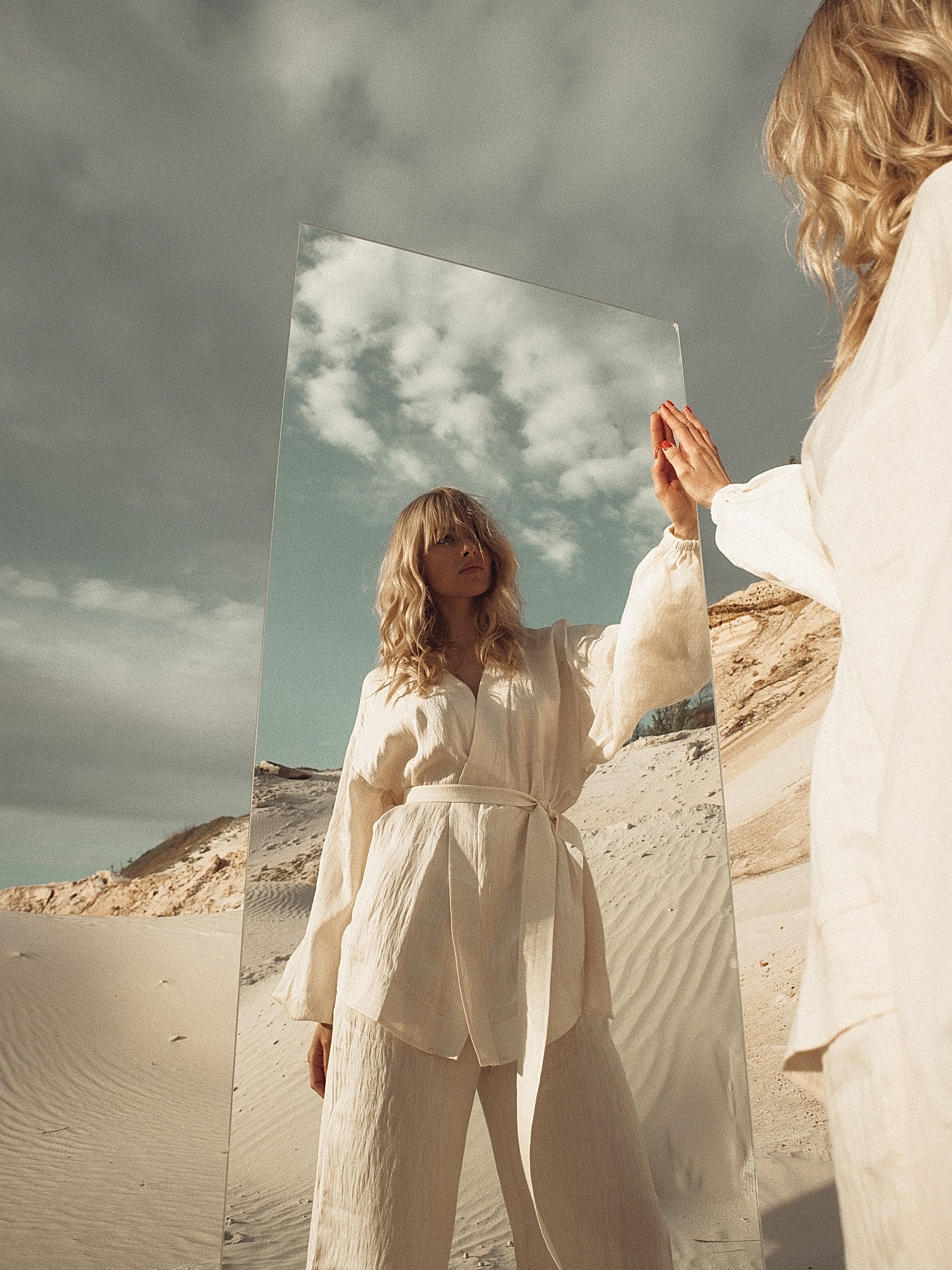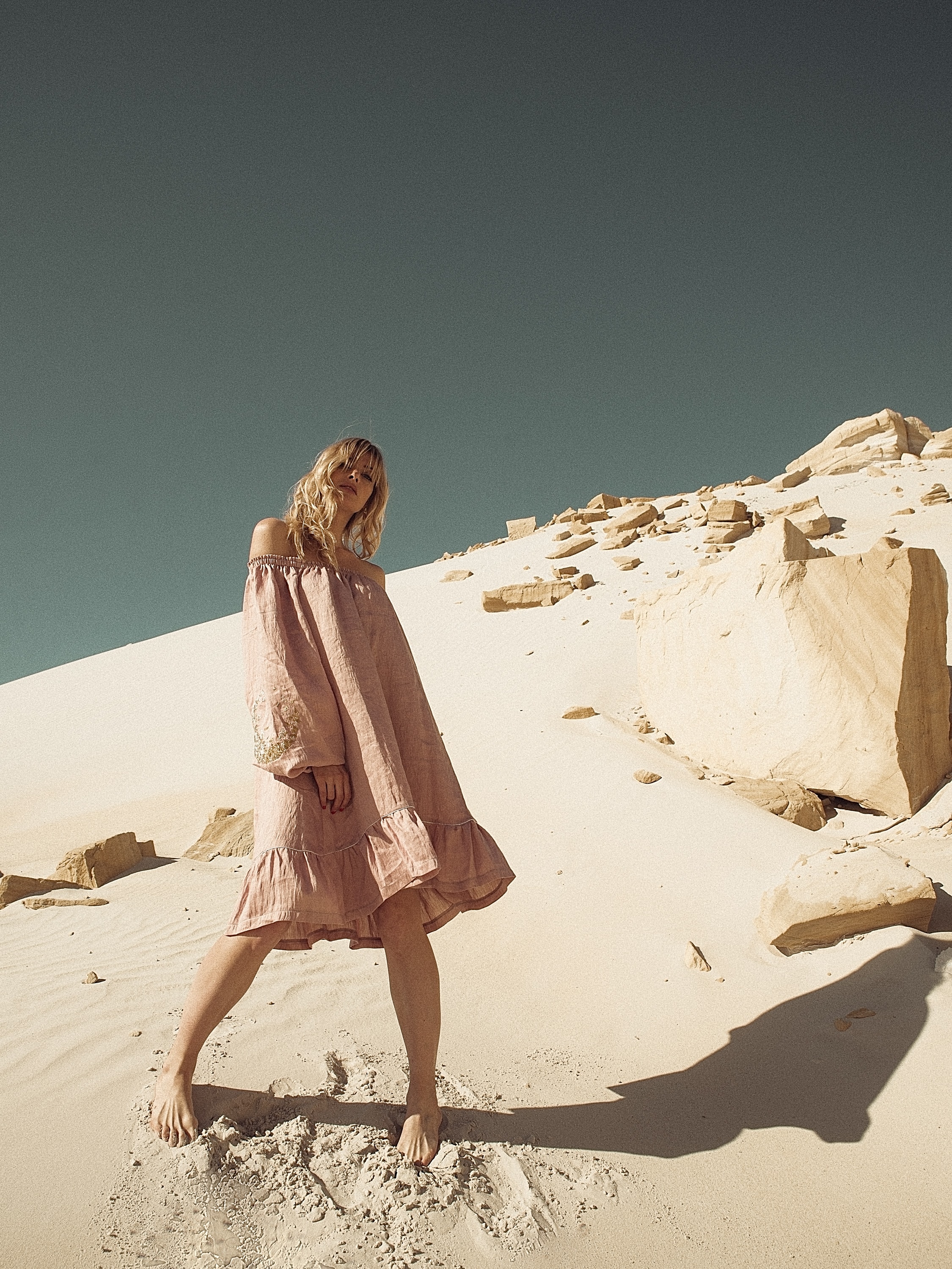 В круизную капсулу украинского бренда вошло несколько моделей в разных цветовых решениях: платья на запах, костюмы с кимоно и легкие струящиеся сарафаны. Вся коллекция выполнена из натурального дикого льна, а в качестве акцента и отличительной детали использовалась вышивка с металлизированными золотыми и серебряными нитями на рукавах. Сарафаны с открытой спиной украшает декор из горного хрусталя и речного жемчуга.